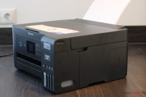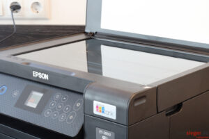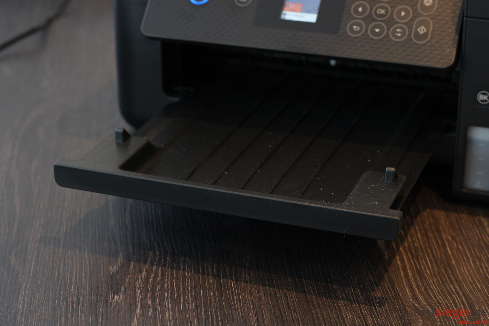 Die Verarbeitungsqualität überzeugt uns insgesamt. Zwar finden wir die ein oder andere wackelige Klappe und vor allem der Papierauswurf wirkt nicht sonderlich stabil, das war es dann aber auch schon mit den Kritikpunkten. Das Gehäuse besteht aus wertig wirkendem Kunststoff. Die Seitenwände des Geräts sind recht dick und lassen sich nur schwer eindrücken. Produktionsrückstände oder unsauber verarbeitete Kanten entdecken wir nicht. Die Spaltmaße liegen im Normbereich. Die beweglichen Elemente wie Klappen oder herausziehbare Fächer sind sauber in das Gehäuse integriert und lassen sich problemlos verwenden. Antirutschelemente auf der Unterseite sorgen in Kombination mit dem Eigengewicht des ET-2850 für eine ordentliche Standfestigkeit. Zwar lässt sich das Gerät ohne größere Probleme verschieben, es fällt aber nicht beim kleinsten Stoß vom Schreibtisch.