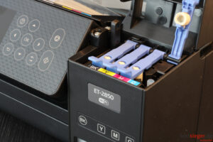 Das EcoTank-System soll Nutzerinnen und Nutzern bares Geld beim Drucken sparen. Dabei kommt der ET-2850 ohne gängige Druckerpatronen aus. Stattdessen befinden sich Tintenflaschen für die Farben Cyan, Magenta, Yellow und Black in der Verpackung. Diese einfach auf die entsprechende Öffnung der Tanks setzen und die Tinte beginnt automatisch zu fließen. Sobald der entsprechende Behälter gefüllt ist, stoppt der Vorgang automatisch. Das funktioniert in der Praxis wunderbar und sehr einfach. Bereits nach kurzer Zeit sind die Tanks gefüllt. Dank der Bauform passen die jeweiligen Flaschen auch nur auf den korrekten Tintenbehälter. Beim Abnehmen kann etwas Tinte aus den Flaschen tropfen. Wer jedoch nicht allzu lange mit dem Umdrehen wartet, sollte keine Probleme haben. Praktisch: Die Tanks verfügen über Fenster, durch die der Tintenfüllstand jederzeit gut erkennbar ist.