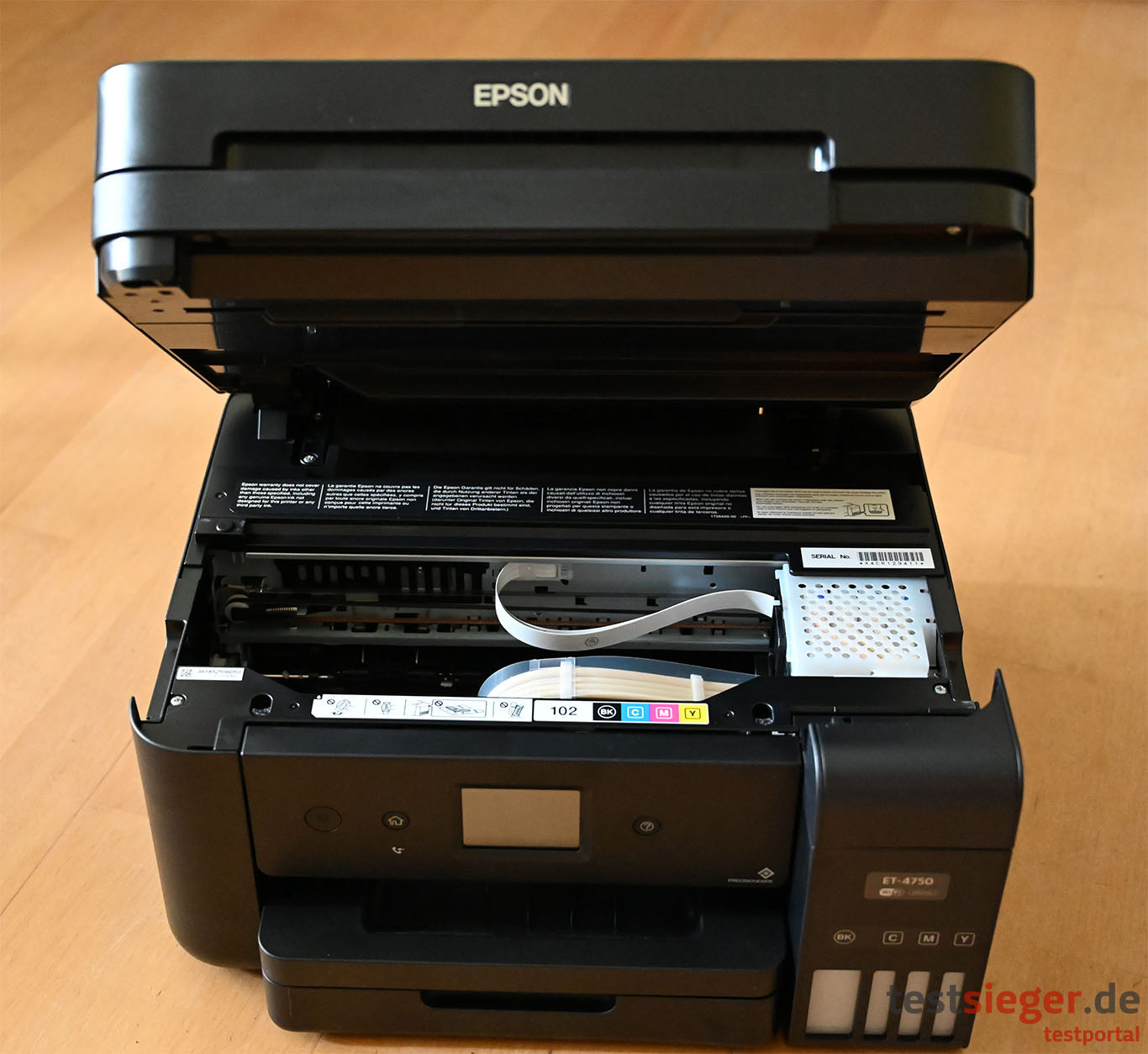 Danach gilt es, den Epson ET-4750 funktionsfähig anzuschließen. Dazu verbinden wir bei unserem Testgerät nur das Netzkabel, weil wir den Drucker per WLAN anbinden, und folgen den Anweisungen auf dem Display. Die Einrichtung funktioniert im Test fast problemlos. Einzig die Einrichtung per WiFi mit WPS-Funktion klappt im Test nicht. Abhilfe sorgt die manuelle Einrichtung mit dem Netzwerkschlüssel. Insgesamt müssen Nutzerinnen und Nutzer für die komplette Ersteinrichtung etwa 25 Minuten einplanen. Das ist nicht wenig, aufgrund des Funktionsumfangs aber absolut im Rahmen.