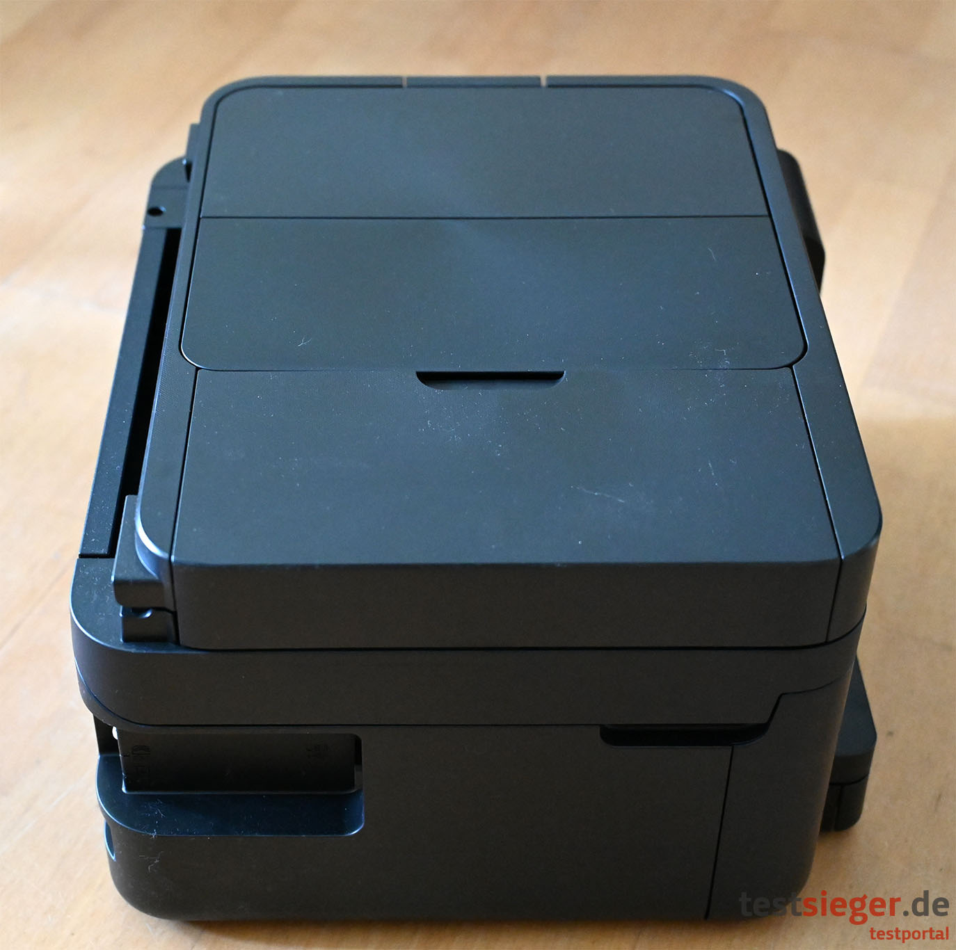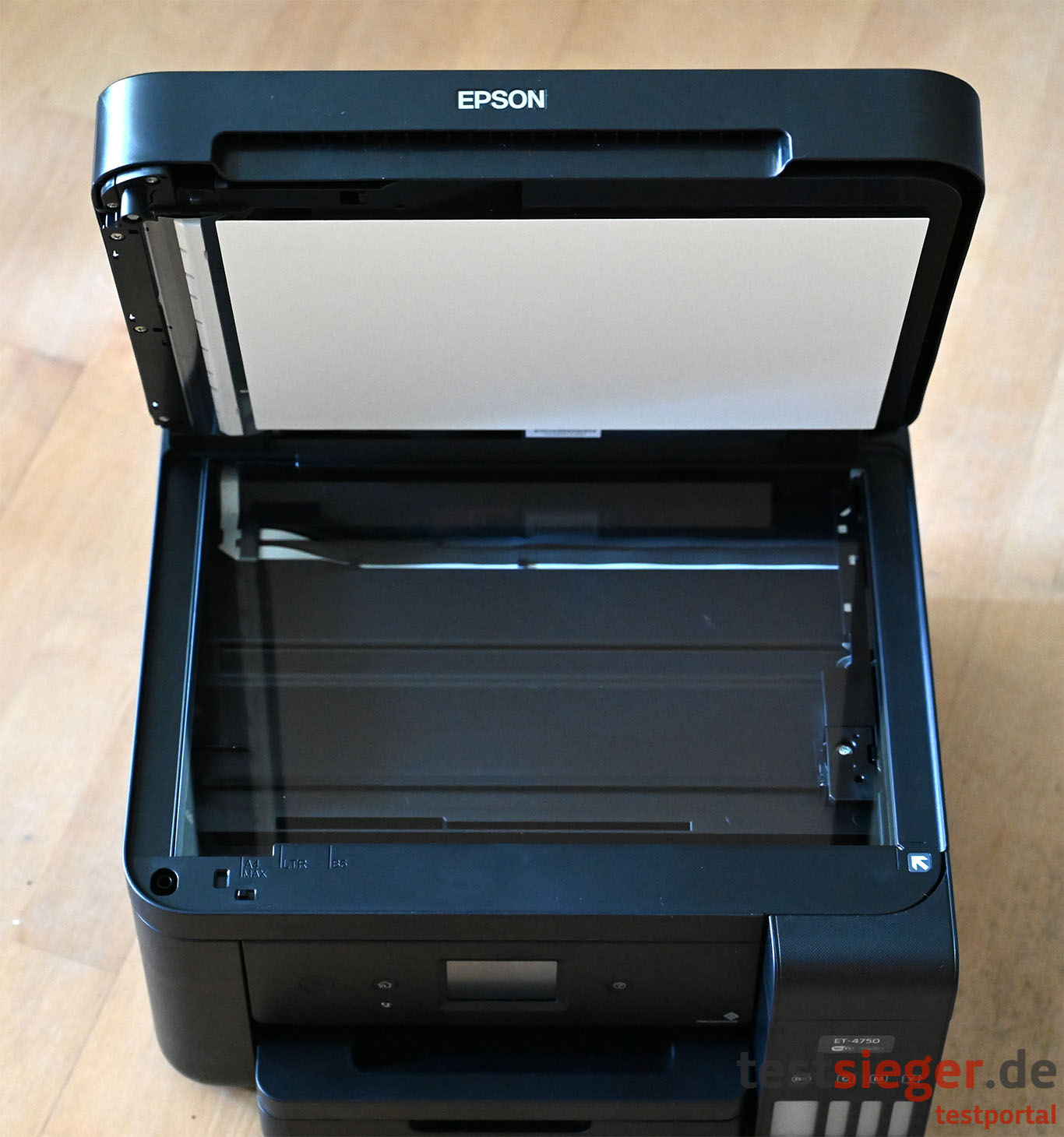 Der Scanner befindet sich unterhalb des Faxeinzugs. Wir klappen den Deckel hoch und können ihn nutzen. Über die Software Epson Scan Utility wird der Scanner wie gewohnt bedient. Die Einstellungen für die Auflösung, Vorschau und Scan-Bereich unterscheiden sich nicht von üblichen Scan-Anwendungen und funktionieren problemlos. Für einen einfachen Farb-Scan von 300 dpi benötigt der Epson ET-4750 etwa 35 Sekunden – bei einer Graustufenvorlage ist das Tempo mit etwa 16 Sekunden doch deutlich schneller. Die gemessenen Werte liegen absolut im Normbereich und nahe bei den Herstellerangaben von 27 Sekunden (Farbe) und 12 Sekunden (Graustufen).