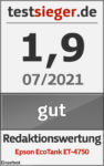 Der Epson EcoTank ET-4750 ist ein guter Multifunktionsdrucker, der geradezu nach der Verwendung im Home-Office lechzt. Er überzeugt durch einen großen Funktionsumfang, einfache Bedienung, gute Druck-, Scan- und Kopierqualität sowie die Möglichkeit, gelegentlich zu faxen. Das EcoTank-System kann ebenso überzeugen wie der sparsame Verbrauch und die niedrigen Folgekosten. Punktverluste gibt es bei der Anordnung der Papierausgabe, bei den teils hohen Druckzeiten in höherer Qualität sowie beim Schnelldruck.