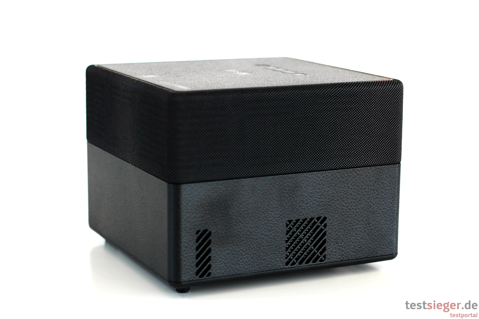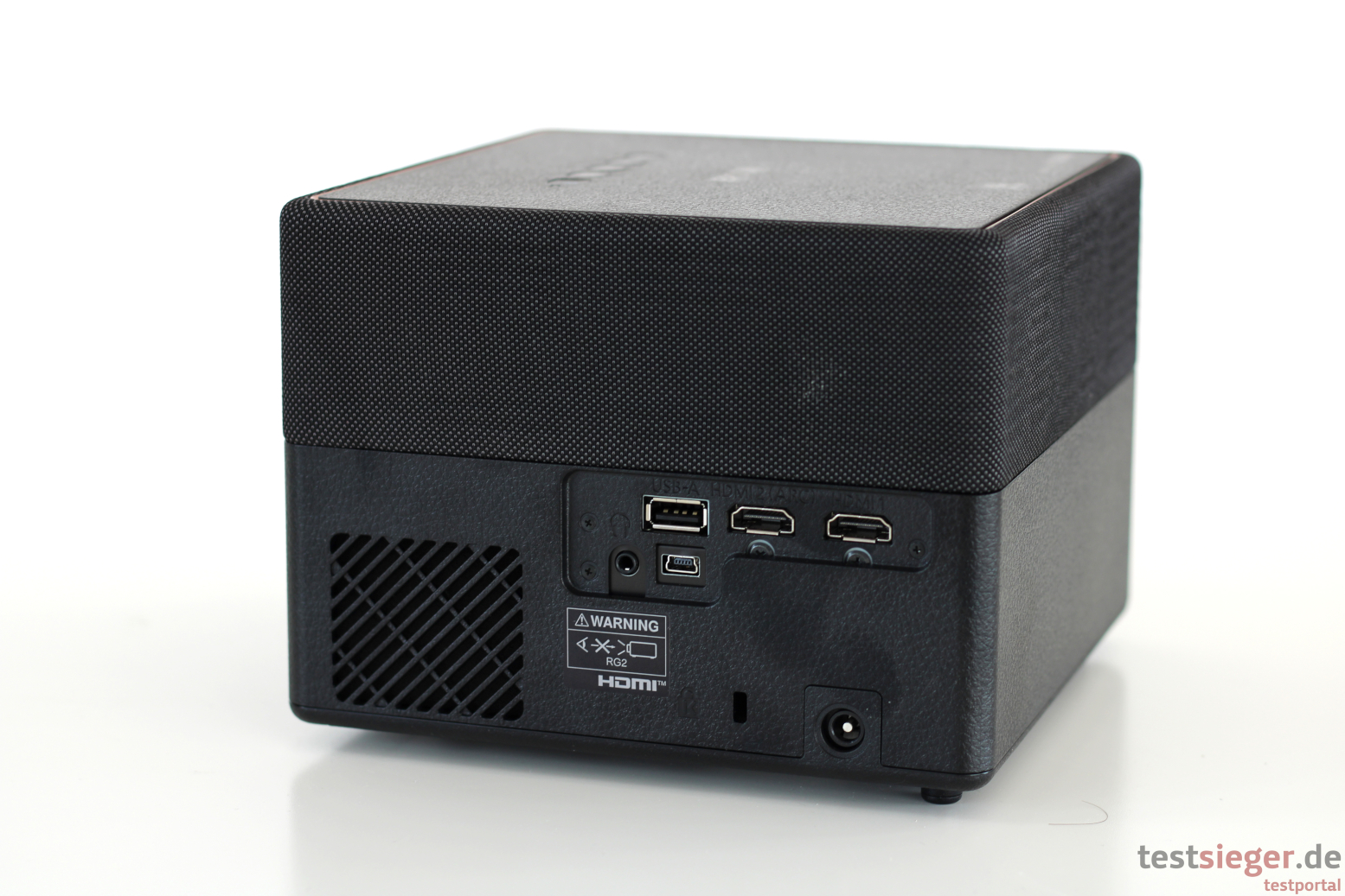 Das ist über die beiliegende Fernbedienung allerdings auch kein Problem. Der kompakte Schalter liegt sehr gut an der Hand, die Tasten fühlen sich sehr angenehm an und haben einen optimalen Druckpunkt. Am Gerät selbst befinden sich nur fünf Taste, um den Projektor zu starten, die Lautstärke zu regeln, das Bild abzuschalten und für die Bluetooth-Kopplung. Alle anderen Funktionen wie der Wahl der Eingangsquelle oder die Navigation durch die Benutzeroberfläche und die Menüs führt der Nutzer mit der Fernbedienung aus.