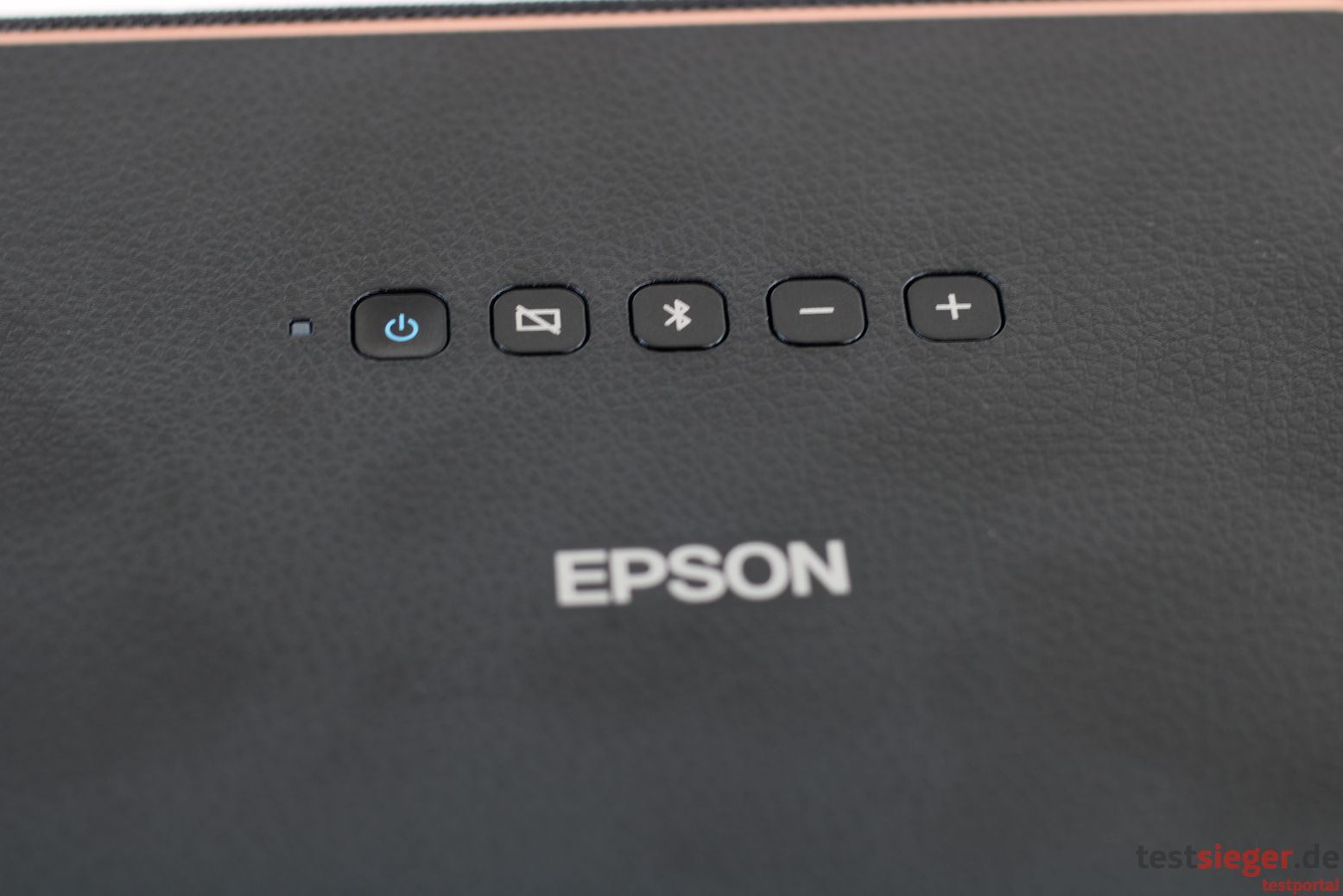 Der Epson EF-12 stellt eine maximale Bildschirmdiagonale von 150 Zoll dar. Wer das gigantische Bild projizieren möchte, benötigt jedoch ein gutes Stück Abstand zur Leinwand. Insgesamt geht der Projektionsabstand aber völlig in Ordnung und ist nicht übertrieben groß. Für ein Bild mit knapp 90 Zoll Diagonale muss der Epson circa 2 Meter von der Leinwand aufgestellt werden. Für den Sound hat sich der Hersteller die Klangexperten von Yamaha mit ins Boot geholt. Das macht sich unserer Meinung nach bezahlt. Der Projektor verfügt über zwei 5-Watt-Lautsprecher. Das Stereopaar ist nach hinten und damit auf das Publikum gerichtet und definitiv eine gute Alternative zu einer externen Lösung. Der Sound ist deutlich und nicht blechern. Auch Dialoge sind jederzeit gut verständlich. Wir spüren bei den tiefen Frequenzen sogar einen gewissen Punch, womit wir bei einem Beamer definitiv nicht gerechnet hätten.