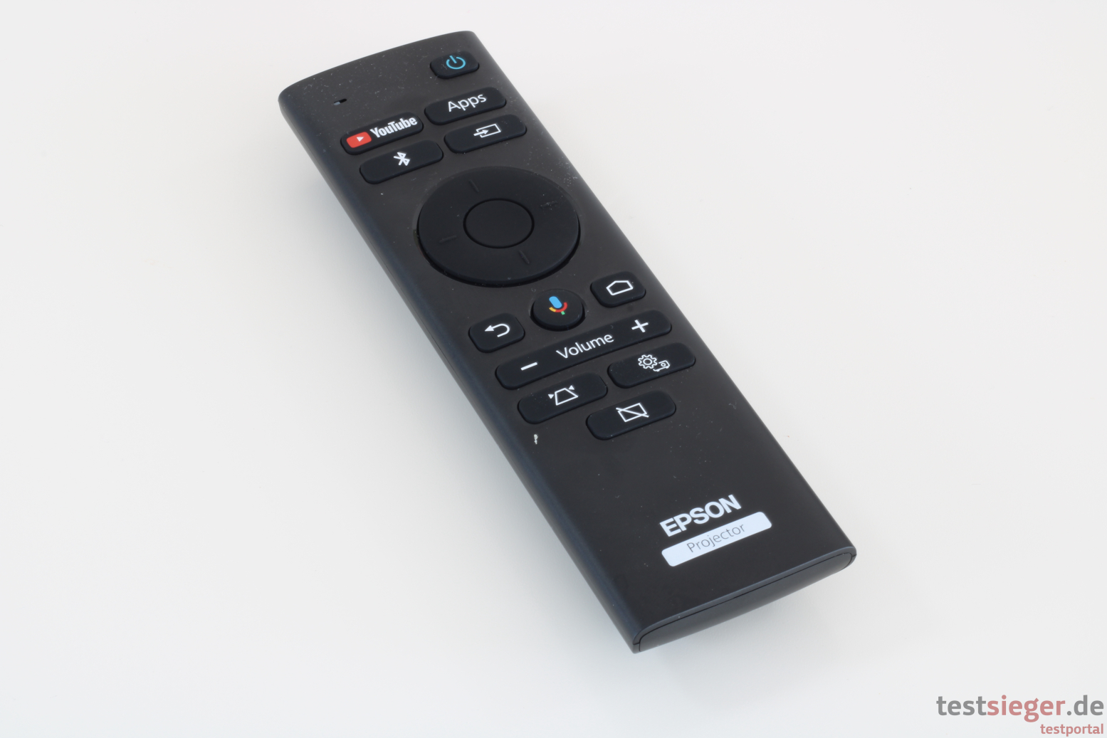 Epson verwendet Android TV als Betriebssystem, wer die Funktionen in vollem Umfang verwenden möchte, muss den Projektor zunächst mit dem eigenen WLAN verbinden und sich mit einem Google-Konto anmelden. Das geht über die Onscreen-Tastatur gut von der Hand, der Nutzer kann aber auch die Einstellungen von seinem Android-Smartphone übertragen. Um die Einrichtung so einfach wie möglich zu gestalten, verfügt der Projektor über einige Automatikfunktionen. So passt das Gerät eigenständig die Schärfe an und gleicht den Trapezeffekt bei schräger Projektion aus. Dementsprechend großzügig gibt sich der Projektor beim Aufstellungsort, Über-Kopf- oder Rückprojektion ist jedoch nicht möglich. Ein kleiner stufenloser, herausfahrbarer Standfuß erlaubt eine leichte Höhenverstellung. Die vertikale Trapezkorrektur liegt zwischen ± 34 Grad, die horizontale sogar bei ± 40 Grad. Insgesamt klappt die automatische Ausrichtung sehr gut, hin und wieder müssen wir aber auch minimal nachkorrigieren.