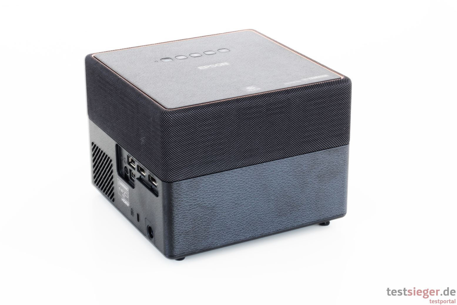 Da ein mobiler Projektor auch gerne mal im Freien zum Einsatz kommt, ist eine gute, robuste Verarbeitungsqualität wichtig. In diesem Punkt liefert der Epson EF-12 ab. Der verwendete Kunststoff ist sehr widerstandfähig und gibt selbst bei höherer Belastung nicht nach. Die Linse ist etwas nach hinten versetzt und dementsprechend ebenfalls gut geschützt. Die Übergänge der einzelnen Komponenten sind sehr sauber, wir spüren so gut wie keine Unebenheiten. Unsauber Kanten oder Produktionsrückstände sind auch nicht vorhanden. Das Gleiche gilt für auffällig große Spaltmaße. Drei leicht gummierte Standfüße auf der Unterseite bieten einen guten Halt, allerdings lässt sich der Projektor durch die ungerade Zahl recht leicht nach links und rechts kippen, vor allem, wenn der vordere Fuß ausgefahren ist. Es besteht jedoch keine Gefahr, dass der Epson auf die Seite fällt.