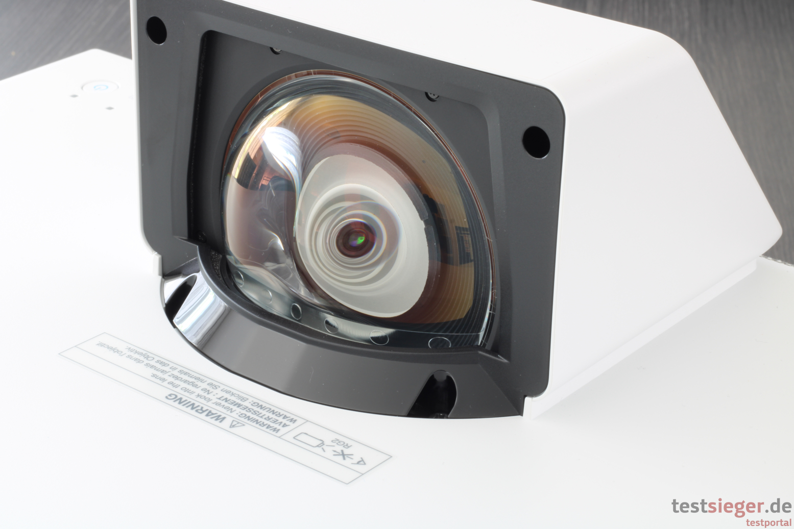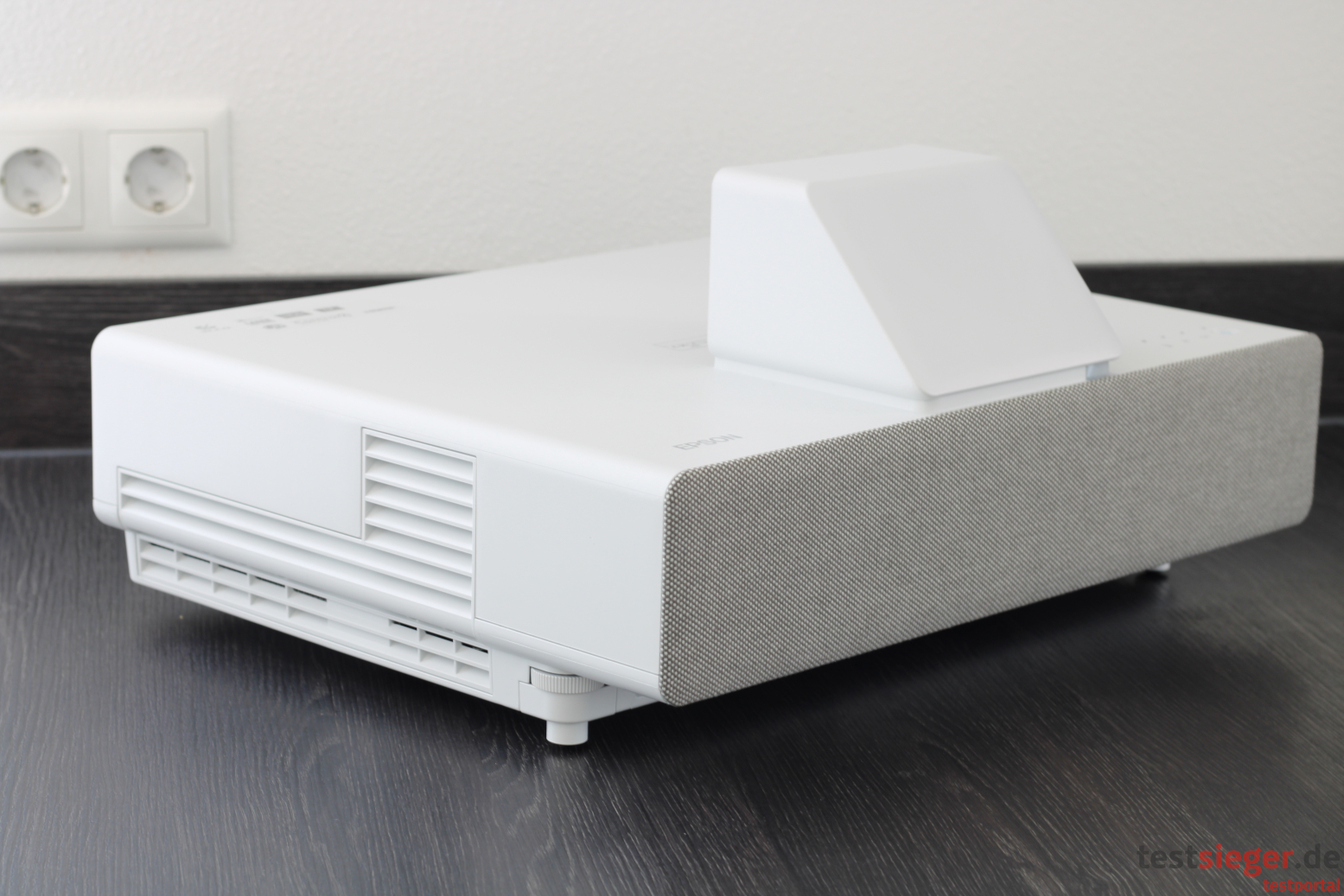 Die Verarbeitungsqualität ist über jeden Zweifel erhaben. Epson verwendet für das Gehäuse sehr festen Kunststoff, der sich selbst unter Kraftaufwand nicht so leicht eindrücken lässt. Die Kanten sind sehr sauber verarbeitet und die einzelnen Komponenten halten gut zusammen. Die abnehmbare Stoffblende ist magnetisch befestigt und schließt sehr sauber mit dem restlichen Gerät ab. Allzu große Spaltmaße entdecken wir nicht, genauso wenig wie Produktionsrückstände. Drei gummierte Standfüße auf der Unterseite sorgen in Verbindung mit dem hohen Eigengewicht für einen ausgezeichneten Halt. Der EH-LS500W lässt sich nur unter Kraftaufwand verschieben.