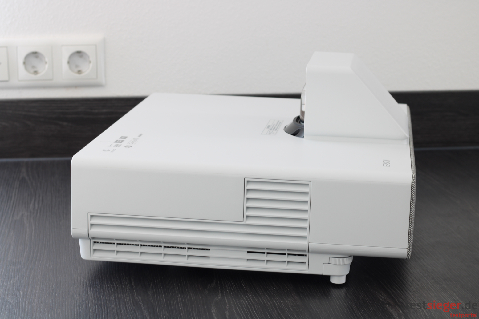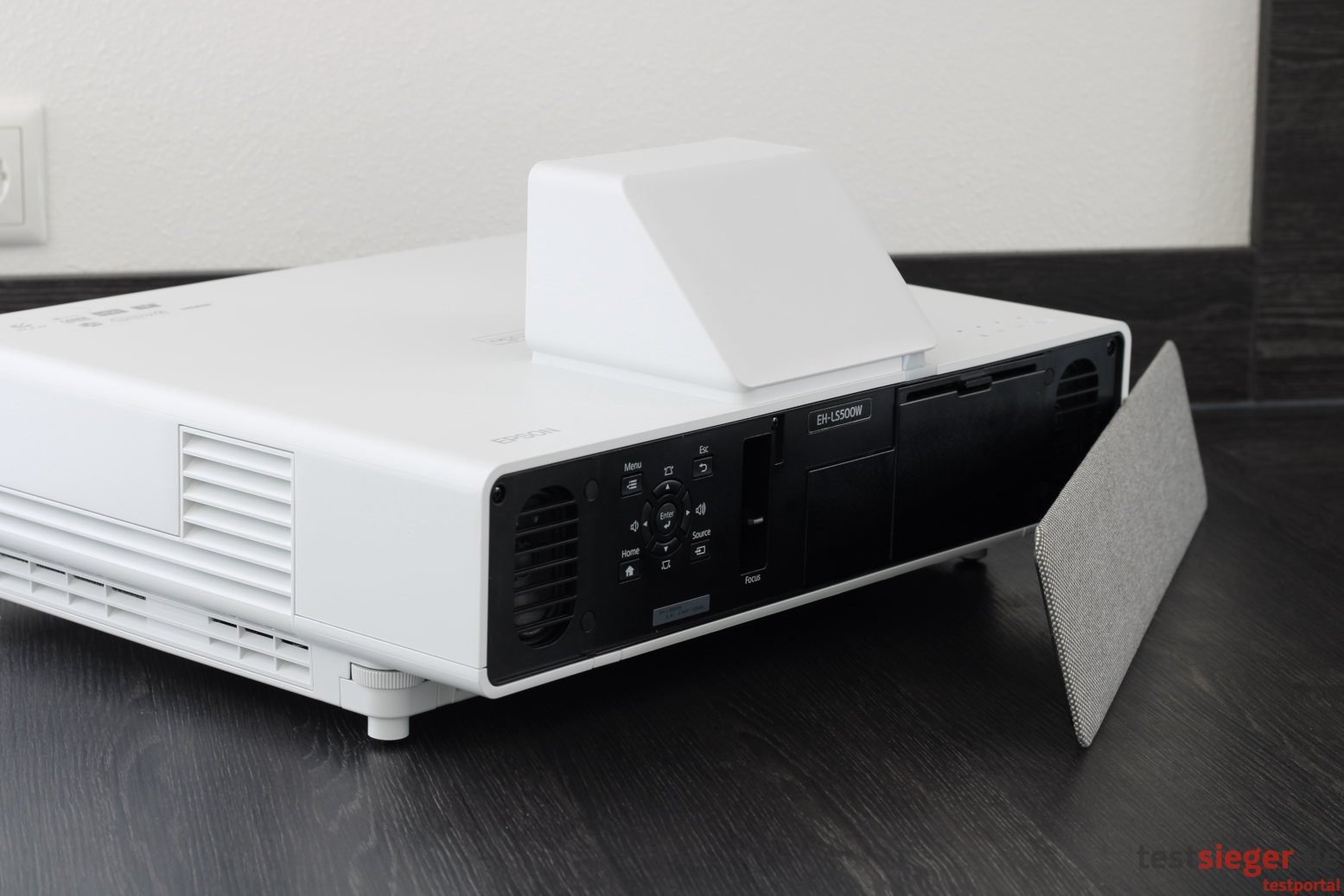 Die Installation geht insgesamt gut von der Hand. Bei der Wahl des passenden Aufstellorts ist der Epson EH-LS500W bauartbedingt nicht so flexibel wie andere Beamer. Eine manuelle Trapezkorrektur ist vorhanden, mit jeweils ±3 Grad in der Horizontalen und Vertikalen fällt diese jedoch recht eng aus. Ein Schieberegler unter der Frontabdeckung regelt die Schärfe. Über Drehräder lassen sich die Standfüße etwas herausfahren, um die Position leicht zu erhöhen oder etwaige Unebenheiten auf dem Untergrund auszugleichen.