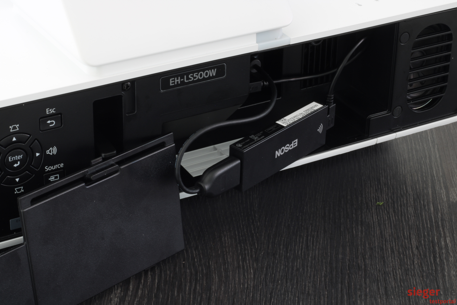 Nach dem Auspacken sind wir zunächst etwas verwundert, dass sich gleich zwei (auf den ersten Blick sehr ähnliche) Fernbedienungen in der Verpackung befinden. Ein Blick in das beiliegende Faltblatt schafft jedoch Klarheit. Neben der Projektor-Remote ist noch ein Schalter für den beiliegenden Android-TV-Stick im Lieferumfang enthalten. Der EH-LS500W ist nämlich nicht am Werk smart, sondern erst durch das Koppeln des Zubehörs. Dieses findet unter der Stoffblende unter einer weiteren Abdeckung Platz. Alle dazu nötigen Kabel liegen natürlich bei.