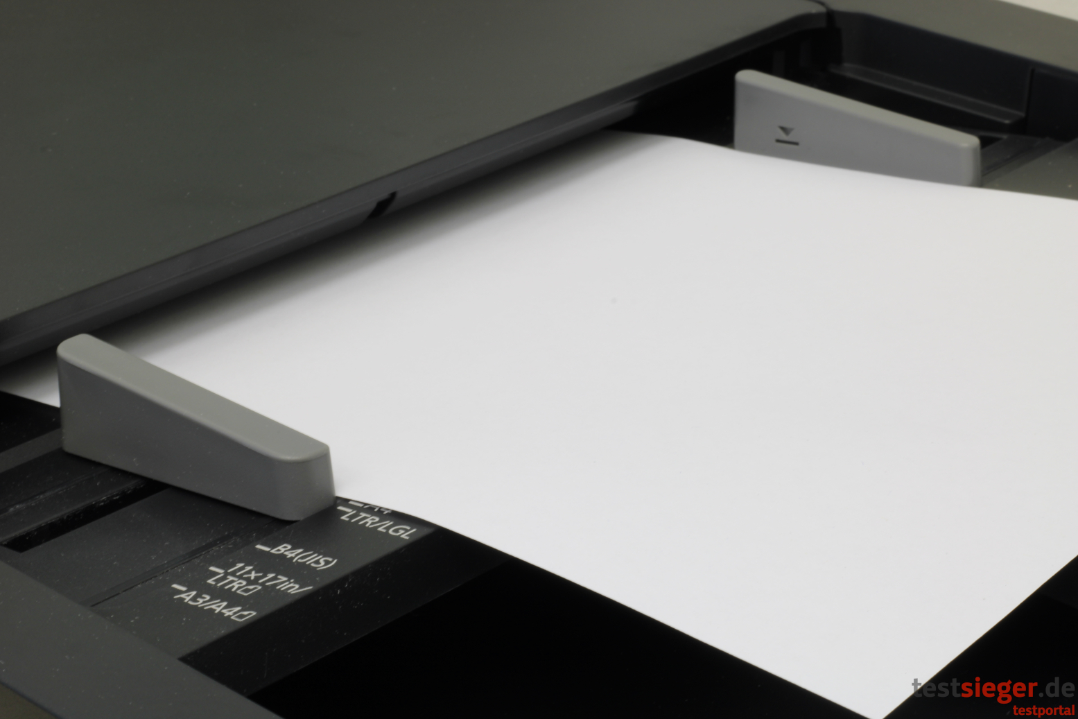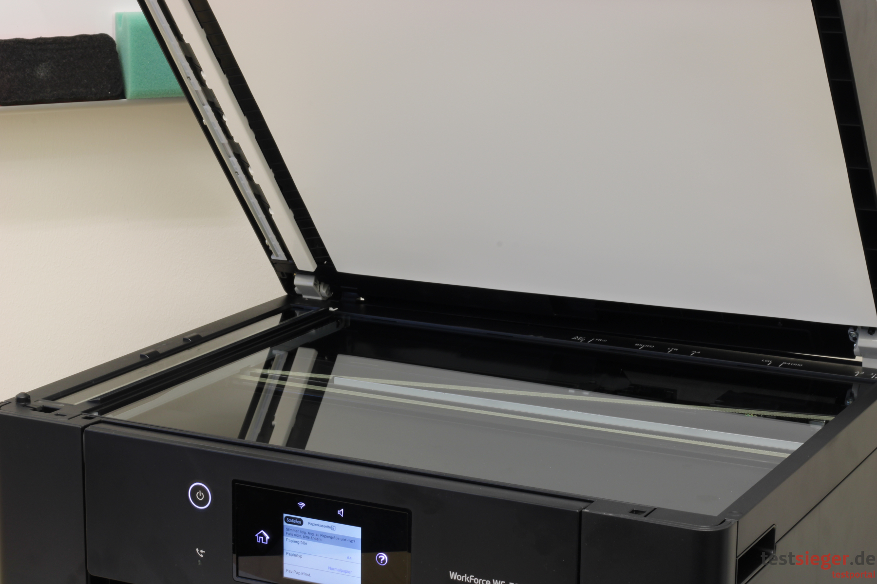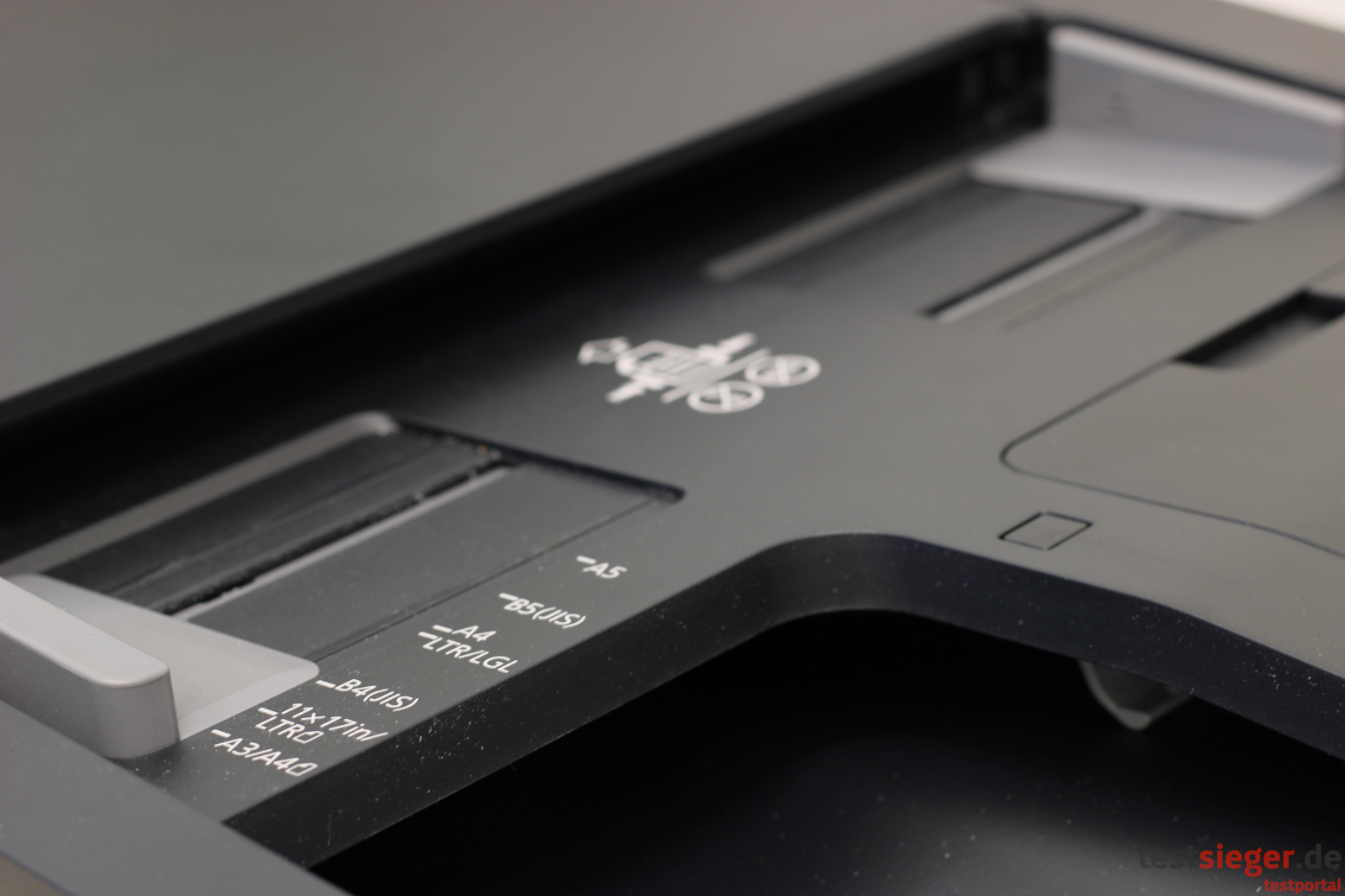Über den Papierkassetten befindet sich das Ausgabefach. Sehr schön: Sobald ein Druck- oder Kopierauftrag eingeht, fährt es automatisch heraus. Das Vorlagenglas ist mit Abmessungen von 44 auf 33 Zentimetern ausreichend groß, um auch im DIN-A3-Format scannen zu können. Die Dokumentenabdeckung lässt sich angenehm leicht öffnen und auch wieder schließen. Auf der Oberseite spendiert Epson dem WorkForce einen automatischen Vorlageneinzug, damit Nutzerinnen und Nutzer zum Kopieren oder Scannen nicht unbedingt auf das Vorlagenglas zurückgreifen müssen. Zudem kann das Multifunktionsgerät so mehrere Dokumente auf einmal verarbeiten. Der Einzug funktioniert während unseres Testbetriebs tadellos. Die Kantenführung lässt sich stufenlos zwischen DIN-A3 und DIN-A5 einstellen. Wir hätten uns eventuell noch gewünscht, dass die Schienen an jeder Position leicht einrasten, wirklich nötig ist das aber nicht.