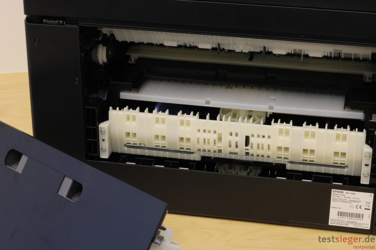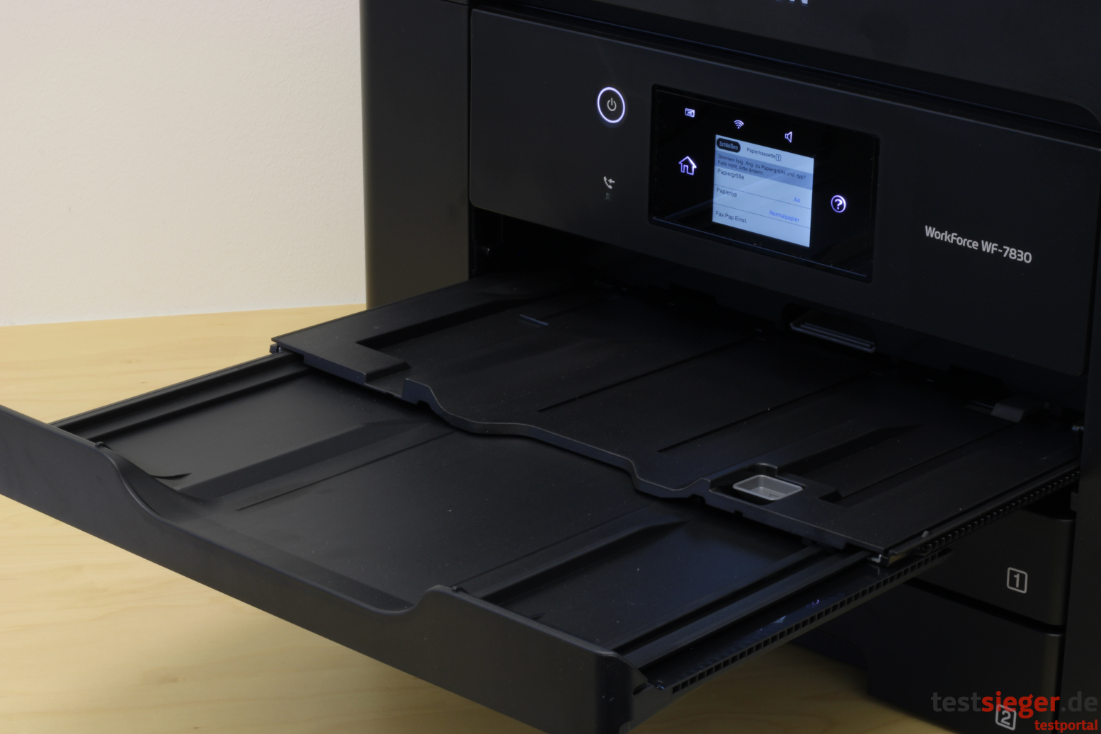 Der Epson WorkForce WF-7830DTWF verfügt über zwei große Papierkassen, die jeweils bis zu 250 Blatt Papier beherbergen können. Dementsprechend müssen selbst Vieldrucker und -druckerinnen nicht allzu häufig nachlegen – ausgezeichnet. Über einen Griff lassen sich die beiden nahezu identischen Kassetten problemlos nach vorne herausziehen und sobald mit Papier gefüllt auch einfach wieder komplett im Gehäuse versenken. Standardmäßig reicht die Kapazität für maximal DIN-A4, bietet dank der flexiblen Kantenführung aber auch für kleinere Formate Platz. Wer das DIN-A3-Format verwenden möchte, betätigt den entsprechenden blauen Hebel und kann beide Fächer noch weiter herausziehen, damit sich auch das große Papier einlegen lässt. Dann passen die Behälter natürlich nicht mehr ganz in das Gehäuse, es befindet sich allerdings eine Abdeckung im Lieferumfang, um zumindest den gröbsten Staub und Schmutz fernzuhalten.