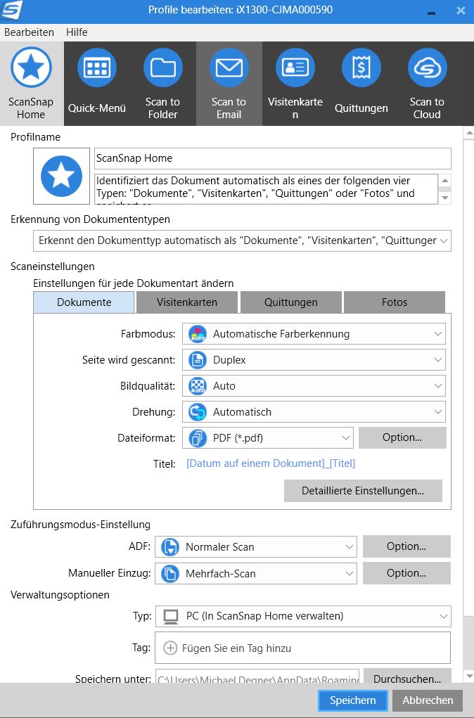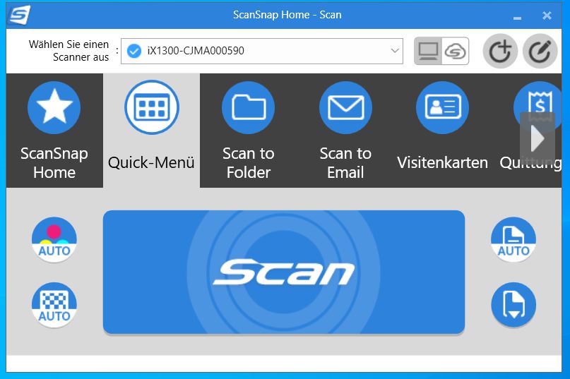 Die ScanSnap Home-Software ist insgesamt recht gut strukturiert, trotzdem wirkt sie zunächst etwas bieder. Nachdem wir uns mit der Bedienung und den Einstellungsmöglichkeiten vertraut gemacht haben, finden wir uns jedoch gut zurecht und haben keine Probleme. Der große Scan-Button im oberen linken Eck startet sich das Scan-Menü. Hier haben wir die Möglichkeit, Dokumente in einem Ordner zu speichern oder an eine Mail-Adresse zu schicken. Zudem sind Optionen für Visitenkarten und Quittungen enthalten. Sehr praktisch: Der Scanner erkennt Überschriften oder Ähnliches auf dem Dokument und benennt die Datei direkt dementsprechend. Das funktioniert nicht immer perfekt, aber zumindest einen groben Hinweis geben die Namen.