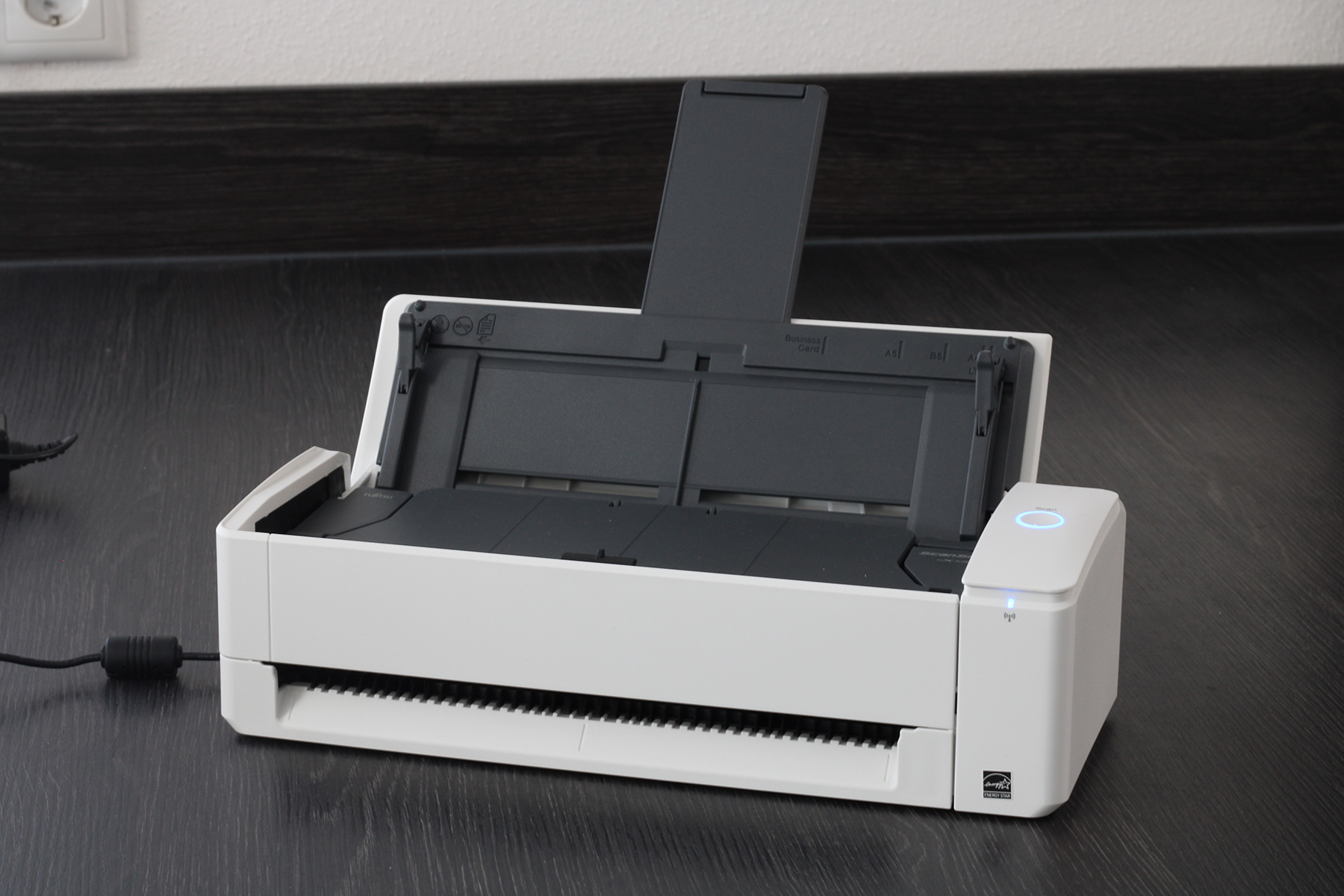Ein Status-LED-Ring um die Scan-Taste signalisiert zudem, dass der Fujitsu betriebsbereit ist. Sobald wir die obere Klappe öffnen, erwacht der Scanner automatisch aus dem Standby-Modus. Intelligent gelöst: Sobald wir beim Öffnen einen kleinen Widerstand überwinden, klappt noch die Papierhalterung nach oben. Somit ist der Fujitsu mit nur einem Handgriff einsatzbereit.