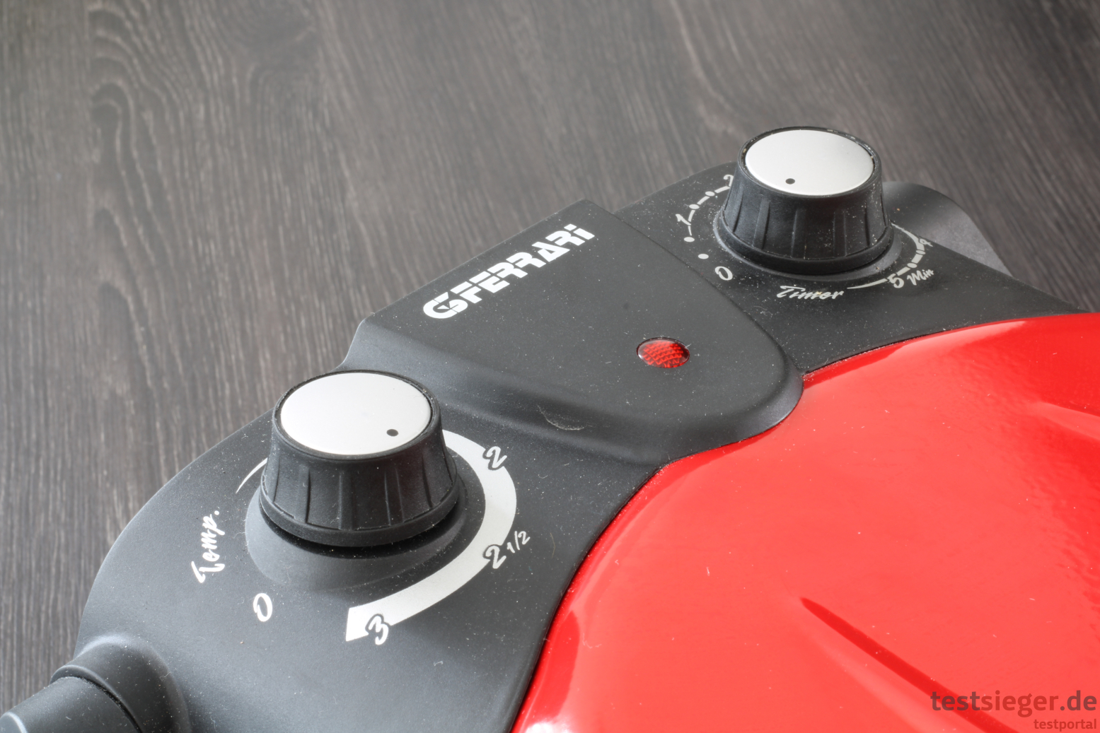 Das Stromkabel misst ziemlich genau einen Meter und sollte damit für die meisten Küchen genügend Flexibilität bieten, ein halber Meter mehr hätte aber natürlich auch nicht geschadet. Im Gehäuse ist kein Platz für die Strippe und der Nutzer muss es anderweitig bei Nichtgebrauch verstauen. Die Bedienung bereitet keine Probleme. Der Pizzamaker verfügt über zwei große Drehräder an der Oberseite, die sich angenehm greifen lassen und durch einen leichten Drehpunkt überzeugen. Das Linke ist für die Temperaturwahl zuständig, allerdings ist keine Gradzahl angegeben, sondern nur drei Stufen in 0,5er-Schritten. Das ist zunächst etwas verwirrend, die Bedienungsanleitung schlägt zum Pizzabacken die Stufe 2,5 vor, was sich im Test als plausibel erweist. Beim rechten Drehrad handelt es sich um einen mechanischen 5-Minuten-Timer, der durch konstantes Ticken seine Aktivität verrät. Am Ende ertönt ein kurzer Klingelton. Eine kleine Lampe zwischen den beiden Bedienelementen gibt an, ob die Heizschlangen in Ober- und Unterseite in Betrieb sind. Der Deckel lässt sich sehr einfach öffnen. Zwar ist er dank Heizelement und Metallbauweise recht schwer, durch das leichtgängige Gelenk ist die Handhabung trotzdem sehr komfortabel.
