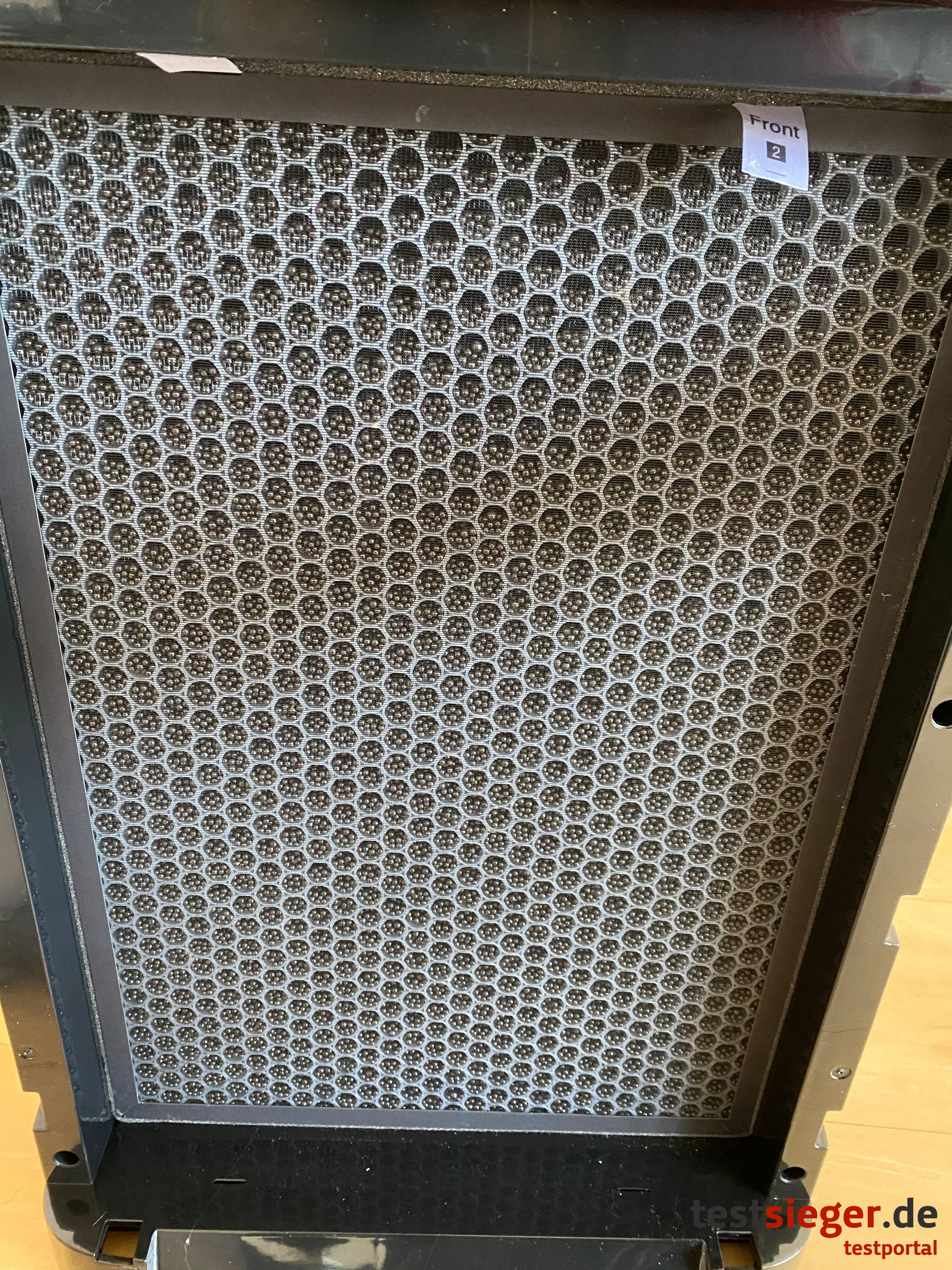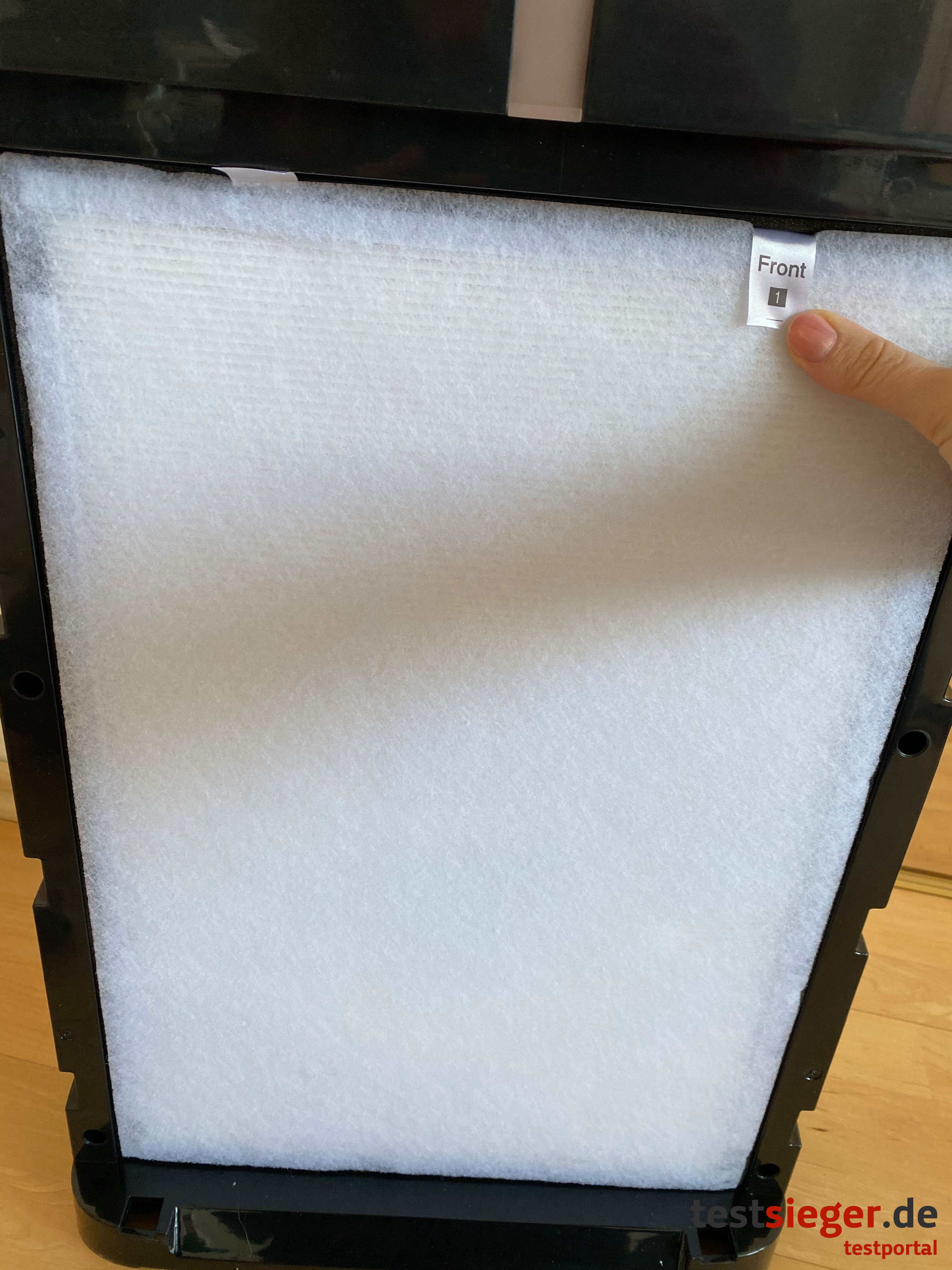 Vor der Inbetriebnahme entfernen wir zunächst sämtliche Aufkleber und packen die Filter aus, um diese hinter der Klappe auf der Vorderseite einzusetzen. Der Magnetverschluss macht das Öffnen und Schließen der Abdeckung kinderleicht. Anschließend schließen wir das Gerät an die Stromversorgung an, woraufhin ein Signalton ertönt. Nun blinkt der rote Power-Knopf ununterbrochen. Durch einmaliges leichtes Tippen springt der Reiniger an. Er läuft kurz auf höchster Stufe und geht dann eigenständig in den Automatikmodus über.