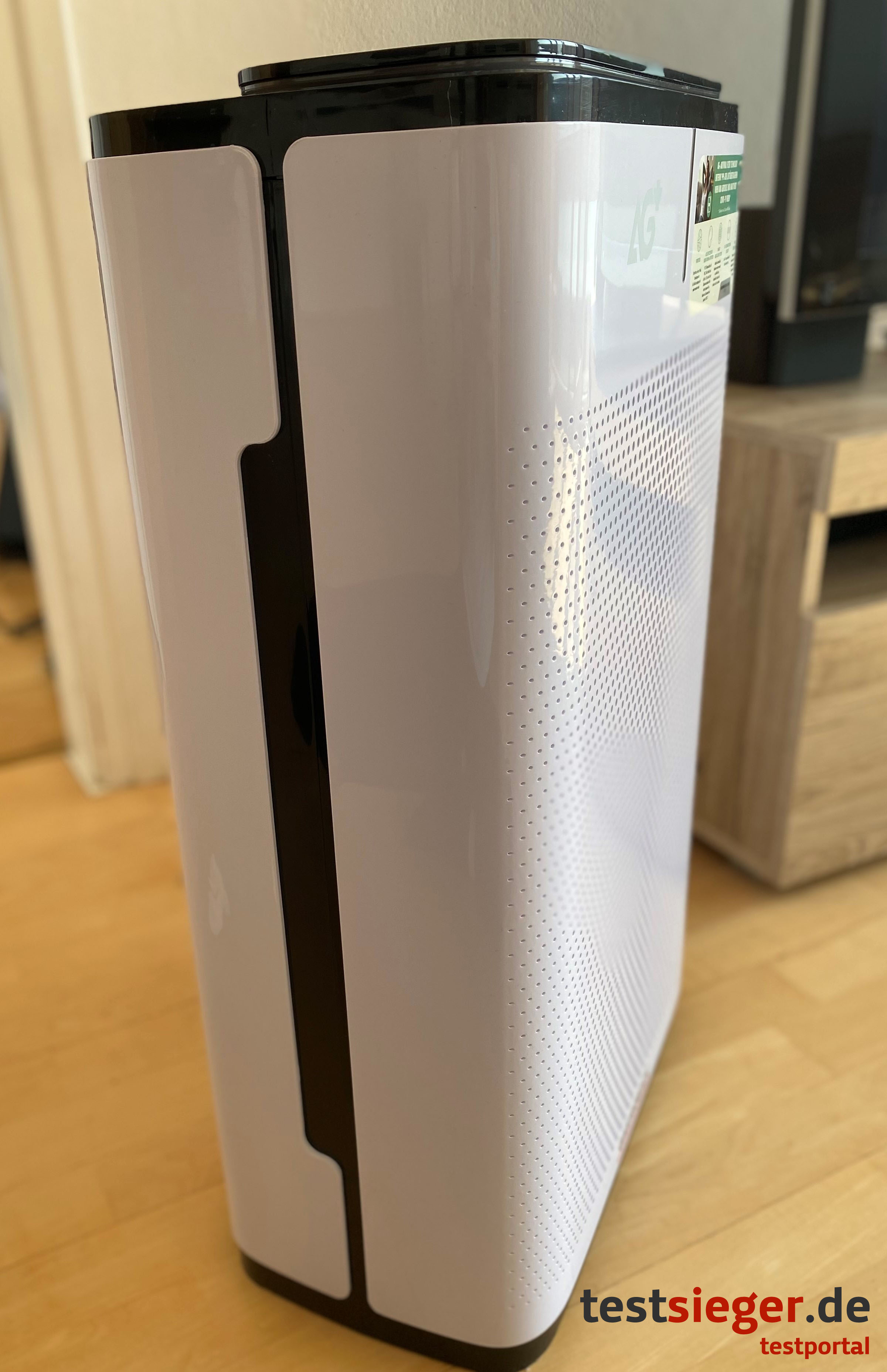 Der Gastroback Luftreiniger AG+ Airprotect kommt in einem schwarz-weißen Design aus glänzendem Kunststoff. Auf der Vorderseite befinden sich viele kleine Löcher aufgrund der dahinterliegenden Filter. Optisch finden wir das Gerät nicht besonders hübsch, allerdings begeistert uns die hochwertige Verarbeitung. Der durchgehend harte Kunststoff lässt sich an keiner Stelle auch nur leicht eindrücken. Das Display bedienen wir per Touch – leider bilden sich hierbei sehr schnell unschöne Fingerabdrücke. Wer den Schutzfilm nicht entfernt, umgeht dieses Problem.Die Abmessungen des Luftreinigers betragen rund 39 Zentimetern in der Breite, 21,1 Zentimetern in der Tiefe und 62,8 Zentimetern in der Höhe. Damit ist er sicherlich nicht zierlich, doch gerade aufgrund der gebotenen Leistung gehen die Abmessungen absolut in Ordnung. Auf die Waage bringt er ungefähr 8,3 Kilogramm. Wer es lieber etwas kompakter möchte, kann sich die kleinere und handlichere Variante AG+ Airprotect Portable näher ansehen.