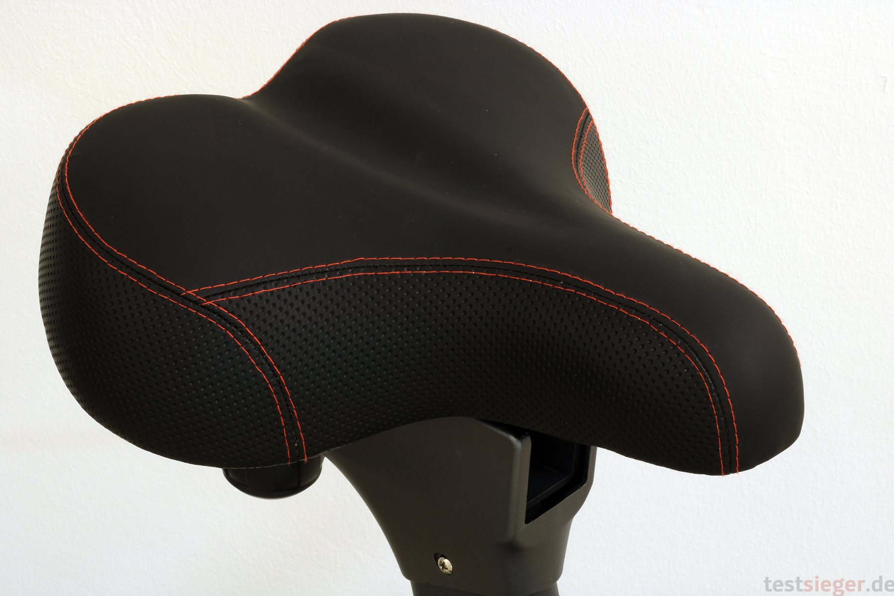 Der Sattel verfügt zwar über eine Gelpolsterung, ist aber dennoch recht hart. Alles in allem bietet er jedoch einen guten Sitz, auch über längere Trainingssessions. Nach spätestens 60 Minuten macht er sich allerdings dann doch deutlich bemerkbar. Der Griff ist wie der Sattel mit einem Gummiüberzug versehen Er bietet selbst bei hoher Trainingsintensität einen ausgezeichneten Halt.