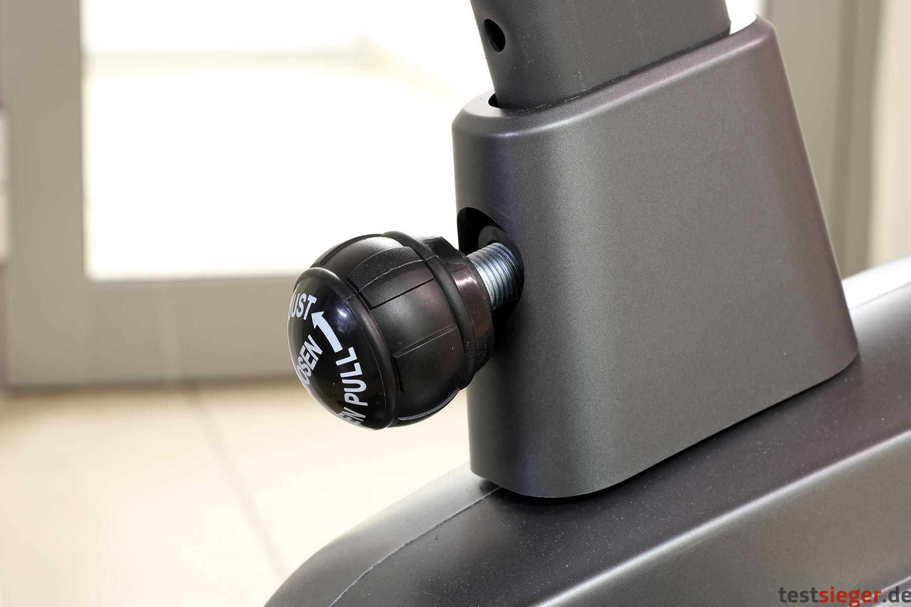 Sitzholm, Sattel und Griff lassen sich an die individuellen Bedürfnisse anpassen. Allerdings muss bei allen drei Komponenten zunächst eine Schraube gelöst werden. Das ist zwar nicht weiter tragisch, ein Schnellspannsystem wäre jedoch etwas komfortabler gewesen. Dank der variablen Komponenten lässt sich das Ergometer ab einer Körpergröße von knapp 1,50 Meter bis zu einer Höhe von zwei Metern komfortabel verwenden. Der Maximalabstand zwischen Sattel und unterster Pedalposition beträgt beispielsweise knapp einen Meter. Der Griff variiert stufenlos zwischen einer aufrechten Position und einer eher sportlichen Neigung. Wer Platzprobleme hat und zum Beispiel mit den Knien an den Griff anstößt, bewegt den Sattel einfach stufenlos nach hinten, bis die optimalen Fahrposition erreicht ist. Hier lässt der Ergo-Motion BT also keine Wünsche offen.