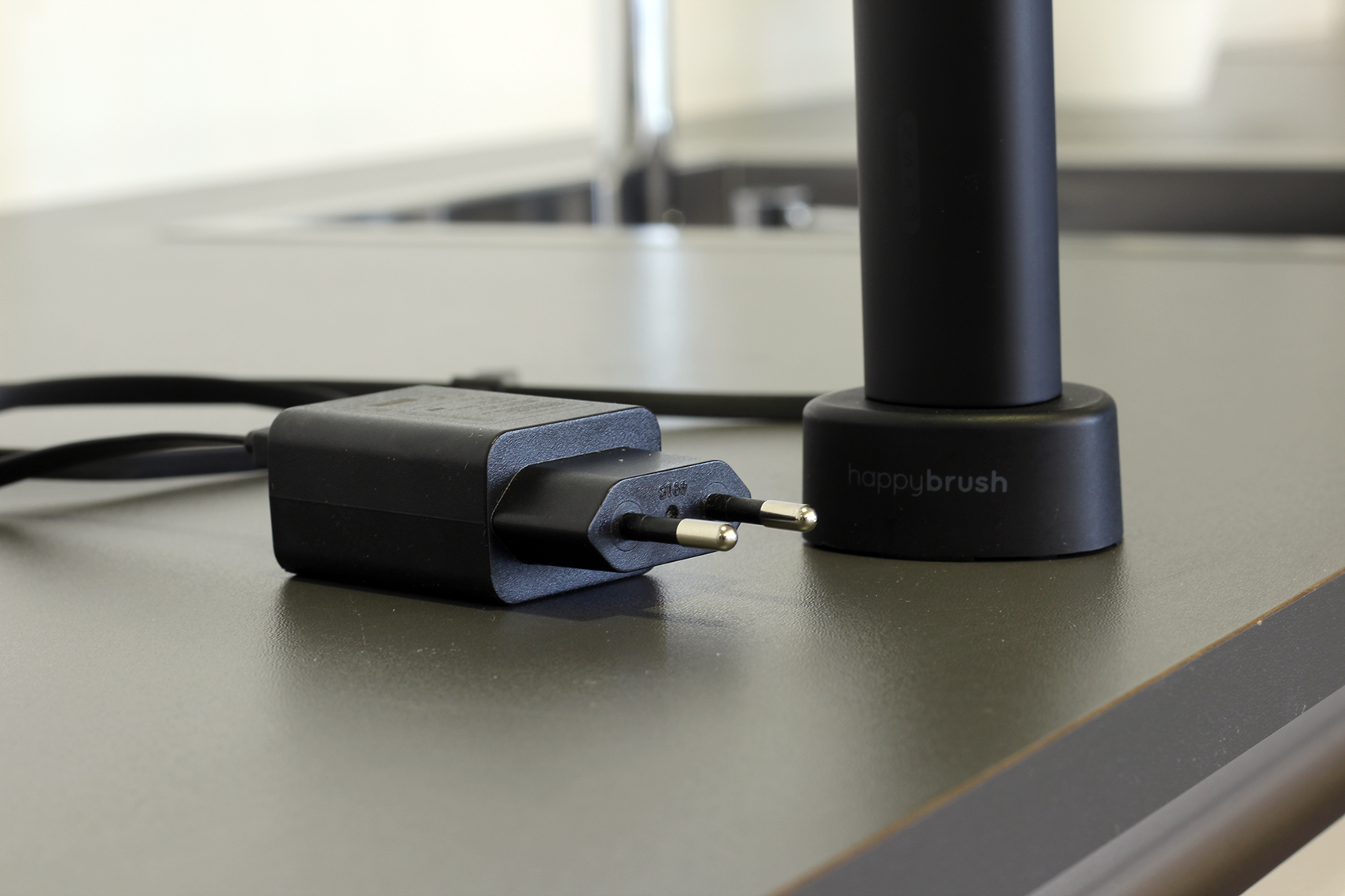 Die Anzeige des genauen Akku-Ladestatus in Prozent vermissen wir dagegen. Schließlich sind die vier LEDs deutlich ungenauer. Apropos Akku: happybrush gibt eine Laufzeit von bis zu drei Wochen an. Diesen Wert können wir bestätigen. Besser noch: In der Praxis hält die Zahnbürste sogar deutlich länger durch. Wir konnten die R2 mit dem neuen Lithium-Ionen-Akku knapp zwei Stunden am Stück betreiben. Bei einer Nutzung von vier Minuten pro Tag ergibt das eine hervorragende Betriebszeit von über vier Wochen. Für eine volle Ladung muss die Zahnbürste etwa sieben Stunden in die Schale.