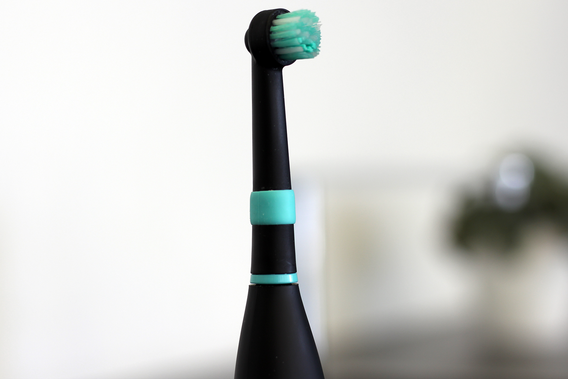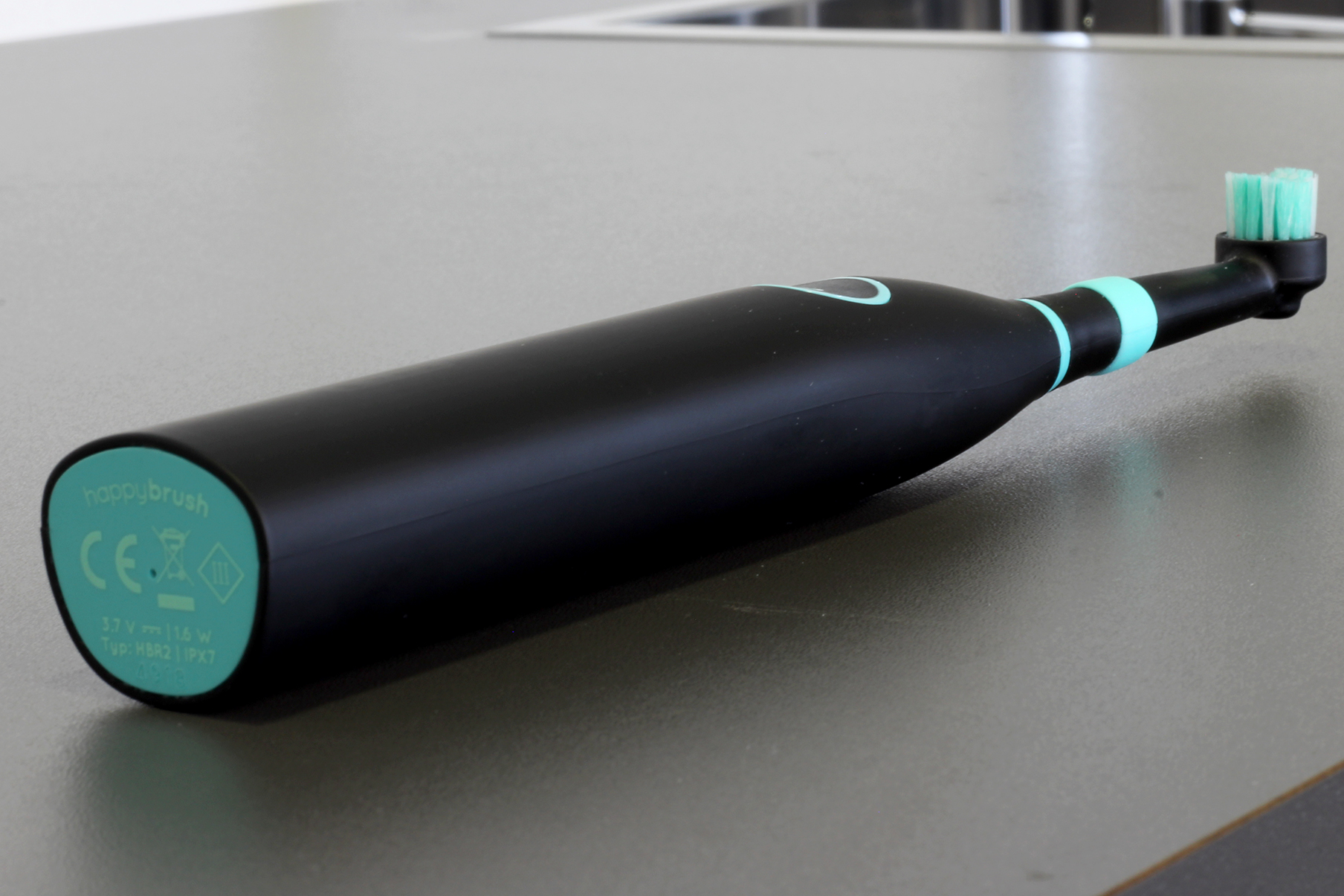 Optisch ist happybrush dem Vorgängermodell treu geblieben. Gut so, schließlich hat uns bereits die ursprüngliche Variante überzeugt. Es herrschen klare, abgerundete Formen und Linien vor. Die Zahnbürste ist fast komplett in Schwarz gehalten, türkisfarbene Elemente lockern die Gesamtoptik etwas auf. Damit muss sich auch die R2 nicht vor den großen Herstellern auf dem Markt verstecken. Allerdings ist die matte Oberfläche recht anfällig für Fingerabdrücke und Kratzer.Die happybrush besteht in erster Linie aus Kunststoff. Die Verarbeitungsqualität lässt keine Wünsche offen. Da das Handteil aus einem Guss geformt ist, sind keine Spaltmaße vorhanden, in denen sich Dreck oder Staub ablagern könnte. Der verwendete Kunststoff ist robust, damit überlebt die Zahnbürste auch Stürze auf den Badezimmerboden. Die Starttaste fügt sich perfekt in das Unibody-Gehäuse ein und steht nicht heraus. Der Bürstenkopf schließt gut mit der Haupteinheit ab und sitzt sehr fest. Die Verarbeitungsqualität hat uns hier ebenfalls überzeugt. Allerdings stört eine Einkerbung an der Rückseite, in der sich Zahnpastarückstände ablagern.