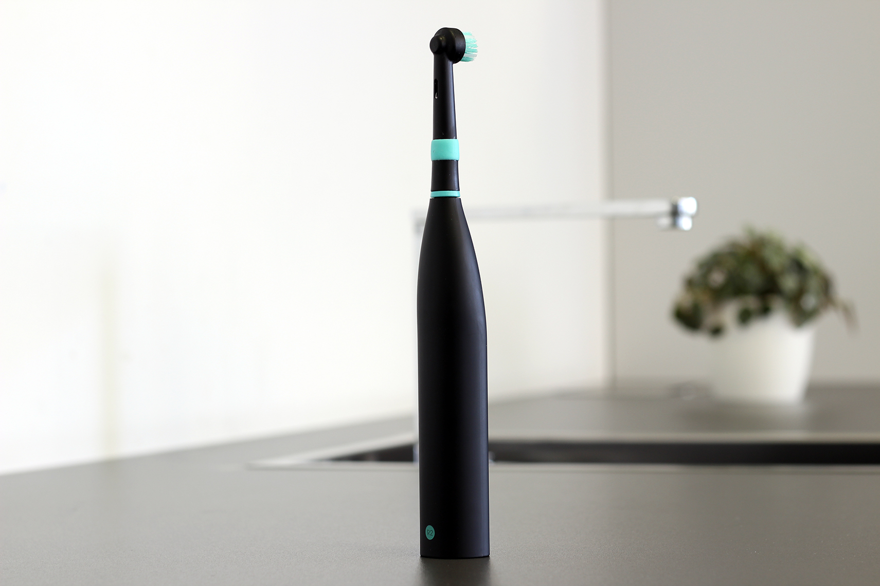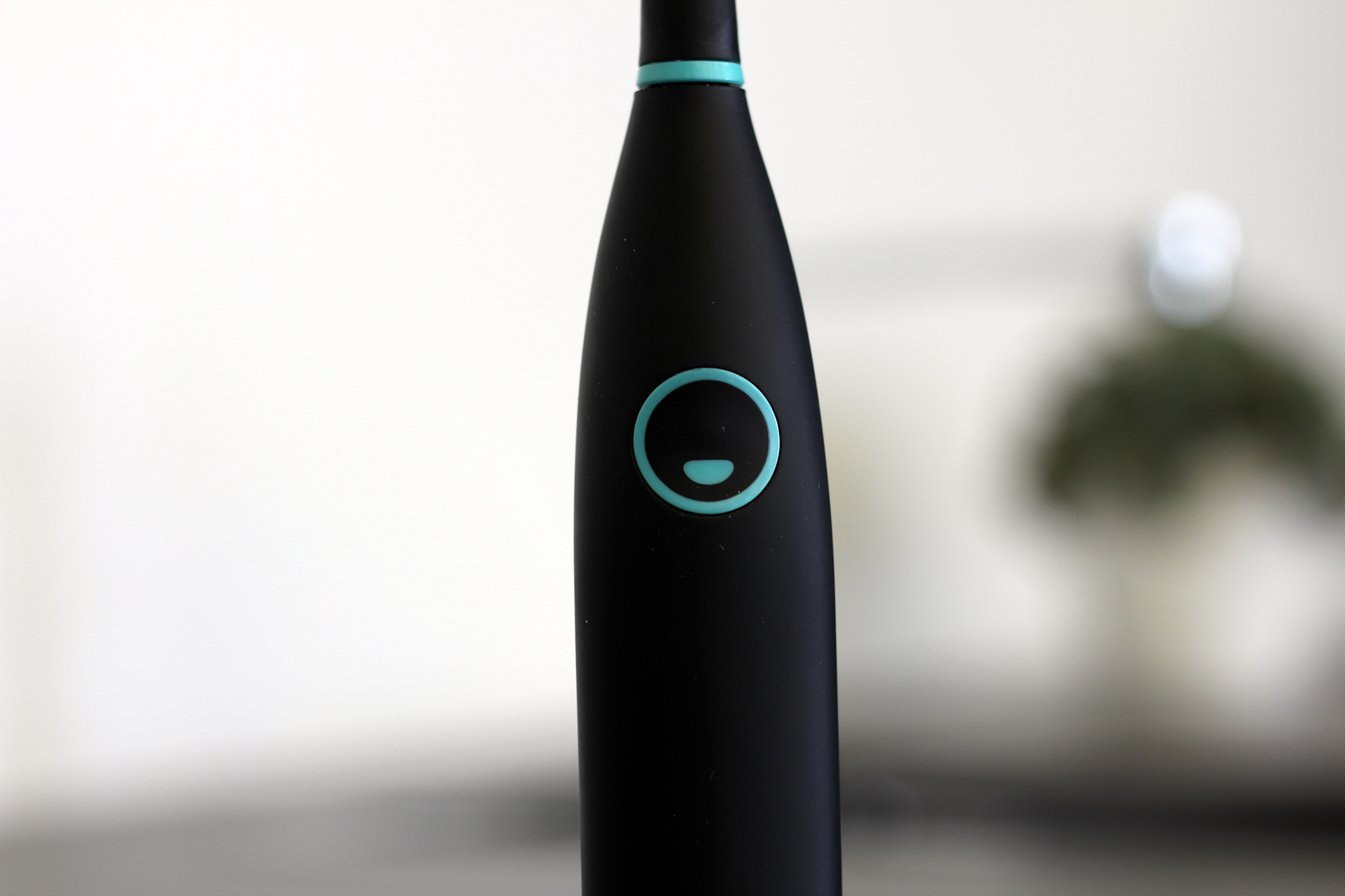 Optisch ist happybrush dem Vorgängermodell treu geblieben. Gut so, schließlich hat uns bereits die ursprüngliche Variante überzeugt. Es herrschen klare, abgerundete Formen und Linien vor. Die Zahnbürste ist fast komplett in Schwarz gehalten, türkisfarbene Elemente lockern die Gesamtoptik etwas auf. Damit muss sich auch die R2 nicht vor den großen Herstellern auf dem Markt verstecken. Allerdings ist die matte Oberfläche recht anfällig für Fingerabdrücke und Kratzer.Die happybrush besteht in erster Linie aus Kunststoff. Die Verarbeitungsqualität lässt keine Wünsche offen. Da das Handteil aus einem Guss geformt ist, sind keine Spaltmaße vorhanden, in denen sich Dreck oder Staub ablagern könnte. Der verwendete Kunststoff ist robust, damit überlebt die Zahnbürste auch Stürze auf den Badezimmerboden. Die Starttaste fügt sich perfekt in das Unibody-Gehäuse ein und steht nicht heraus. Der Bürstenkopf schließt gut mit der Haupteinheit ab und sitzt sehr fest. Die Verarbeitungsqualität hat uns hier ebenfalls überzeugt. Allerdings stört eine Einkerbung an der Rückseite, in der sich Zahnpastarückstände ablagern.