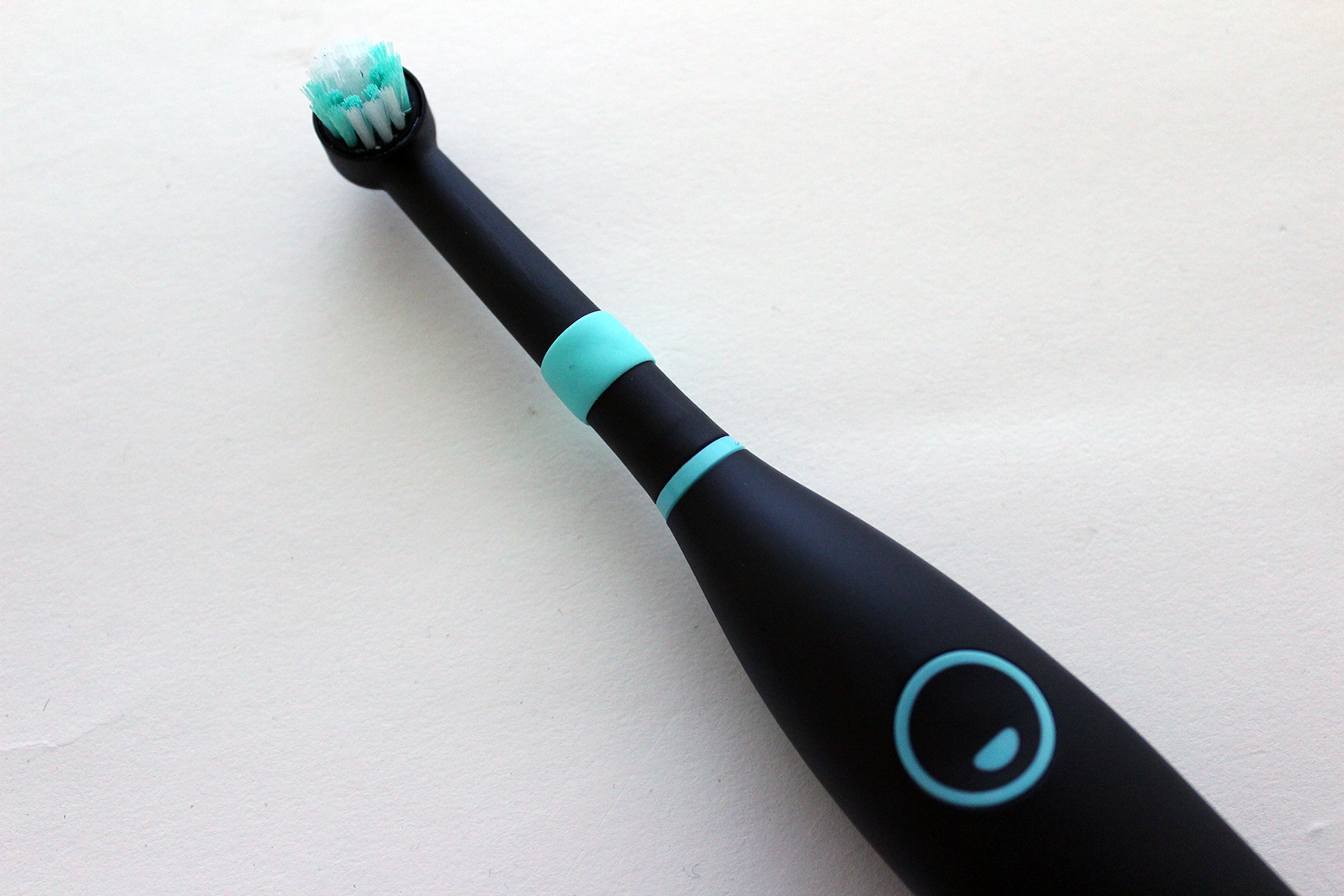 Optisch weiß die happybrush direkt zu überzeugen. Klare, abgerundete Formen und Linien, in Schwarz und Türkis gehalten, verleihen der Zahnbürste ein ansehnliches Äußeres, das sich vor den großen Herstellern auf dem Markt nicht verstecken muss. Der Griff wurde aus einem leicht gummiartigen Material gefertigt. Das fühlt sich gut an und bietet einen sicheren Halt in der Hand – auch bei nasser Oberfläche. Sollte die happybrush doch einmal aus der Hand flutschen, ist das auch kein Problem. Das Material macht einen robusten Eindruck und übersteht selbst mehrere Stürze auf Fliesenboden. Der Powerknopf fügt sich gut in das Gehäuse ein und steht nicht über. Der Bürstenkopf schließt ebenfalls gut mit der Haupteinheit ab. Allerdings ist das Äußere recht anfällig für Fingerabdrücke und Kratzer.Ausstattung und Bedienung