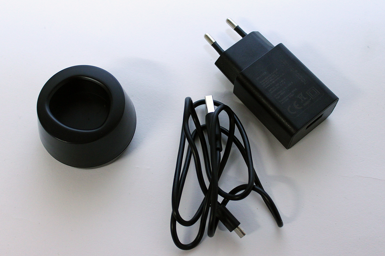 Neben der Motoreinheit befinden sich ein Aufsteckkopf, eine Ladestation, ein MicroUSB-Kabel und ein USB-Netzteil im Lieferumfang. Damit ist alles Wichtige enthalten, wir hätten uns allerdings noch einen zweiten Wechselkopf gewünscht. Zwei zusätzliche Aufsteckbürsten schlagen allerdings nur mit knapp fünf Euro zu Buche und sind damit nicht sonderlich teuer in der Anschaffung. Praktisch: Die farbigen Borsten verblassen mit der Zeit und geben so an, dass es Zeit für einen neuen Bürstenkopf ist. Über das USB-Kabel und den Netzadapter lässt sich die Ladestation mit Strom versorgen. Dann leuchtet das kleine Display – wenn auch nur schwach.