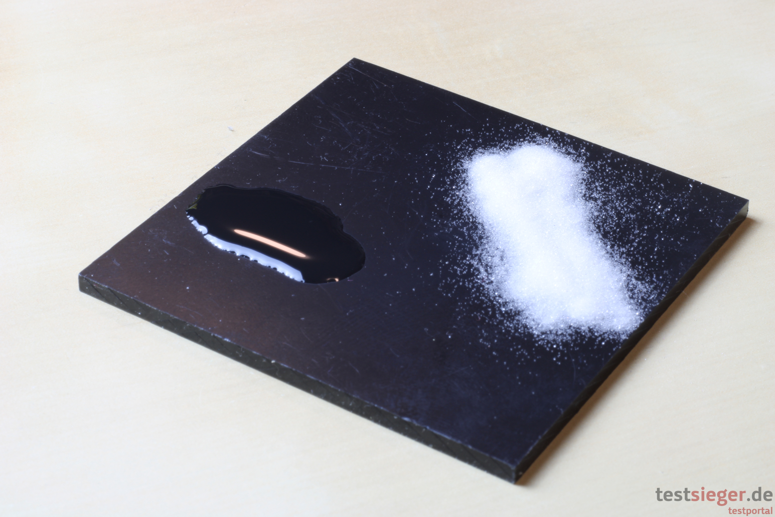 Wir testen die Klebeeigenschaften noch mit weiteren Materialen wie Holz, Glas oder Stein und können auch hier den positiven Gesamteindruck bestätigen. Da sich das erhärtete Material weiter bearbeiten und auch lackieren lässt, eignet sich die Schweißnaht aus der Flasche auch zum Ausbessern von Rissen oder Löchern. Hier ist es jedoch wichtig, dass nicht zu viel Granulat auf einmal verwendet wird. Bei einem tieferen Loch beispielsweise sickert der Kleber knapp 2 Millimeter durch, der Rest Granulat rieselt auf der anderen Seite wieder heraus. Hier ist also etwas Geduld gefragt und der Nutzer muss teilweise recht viele Schichten auftragen, das Ergebnis kann sich jedoch sehen lassen.