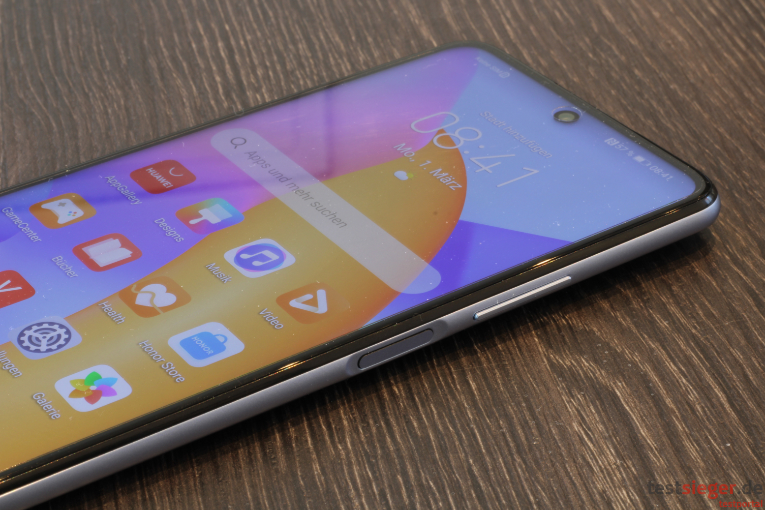 Der 20:9-Bildschirm fällt mit einer Diagonale von 6,55 Zoll sehr groß aus. In Kombination mit einer Auflösung von 2.400 x 1.080 Pixel ergibt sich eine Pixeldichte von 394 ppi. Damit punktet das Smartphone durch eine scharfe Darstellung. Selbst aus näherer Betrachtung erkennen wir keine Bildpunkte. Die Helligkeit dürfte jedoch gerne höher sein. Selbst auf der Maximaleinstellung haben wir Probleme, das Display bei Sonneinstrahlung zu erkennen.