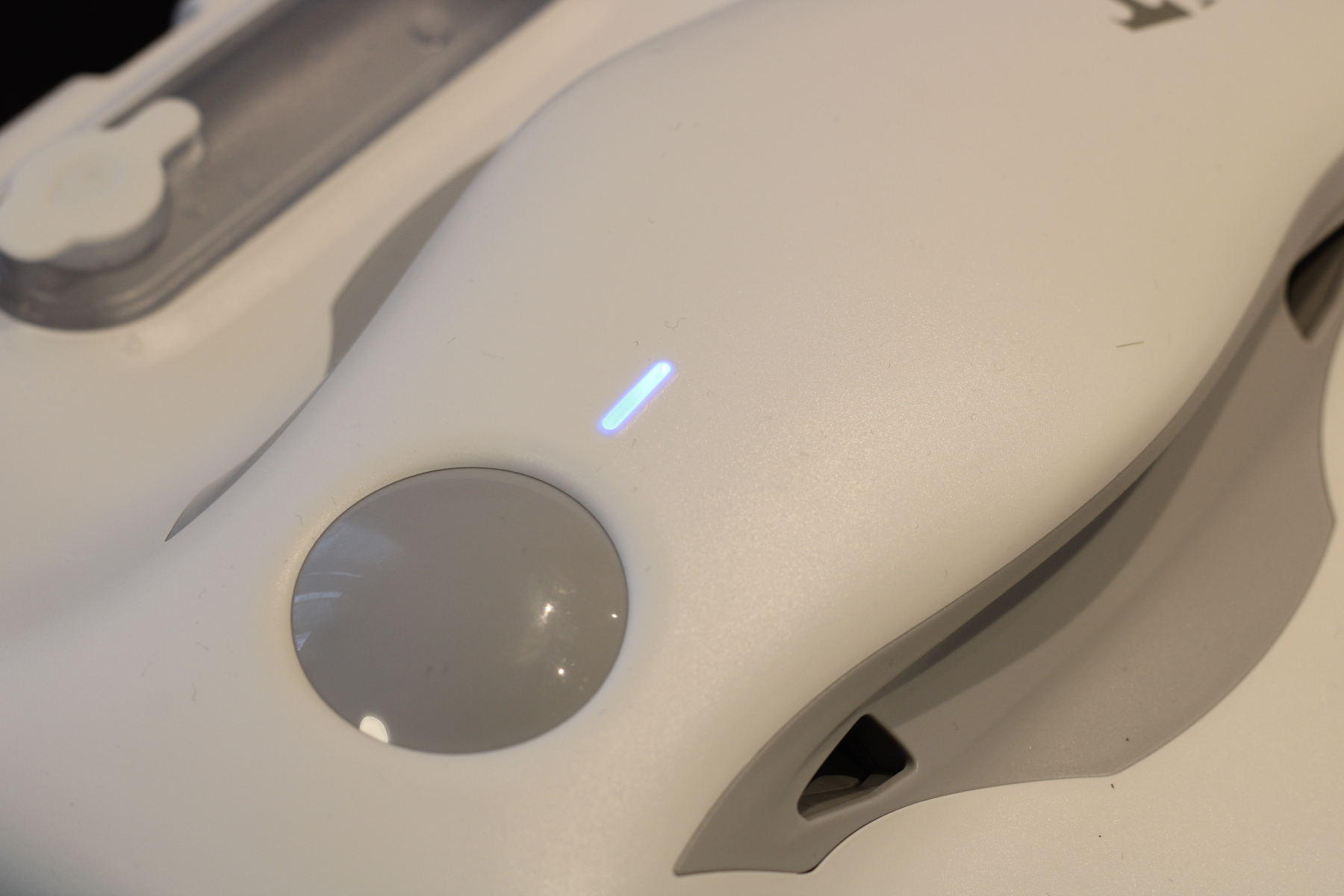 Am Roboter selbst befindet sich nur eine große Taste. Diese reagiert zügig, hat jedoch aus unserer Sicht einen minimal zu festen Druckpunkt. Letzteres behindert uns in der Praxis aber nicht und ist sicherlich kein Dealbreaker. Um den Roboter zu starten, drücken wir den Knopf 3 Sekunden lang. Dann springt er merklich an und wir können ihn auf die zu reinigende Fläche setzen. Das funktioniert dank dem großen ergonomisch geformten Griff auf der Oberseite problemlos. Sofort saugt sich der Hutt dank des recht hohen Anpressdrucks von 3.800 Pascal an, wir müssen keine zusätzliche Kraft ausüben. Ein weiterer Tastendruck und der Wischer nimmt den Betrieb im Standardmodus auf.