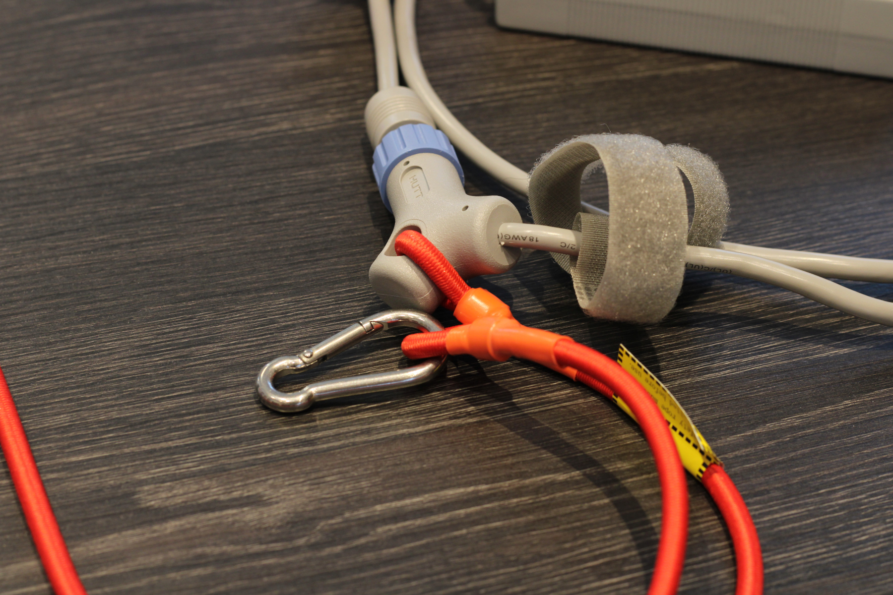 Apropos Sicherheitsmechanismus: Am Stromkabel befindet sich ein starkes Seil, das sich mit einem Karabinerhaken befestigen lässt. Dieses soll den Roboter vor einem Aufprall schützen, wenn er Scheibenkontakt verliert. Aus unserer Sicht ist das Seil jedoch nicht praktikabel. Nutzerinnen und Nutzer müssten es so hoch aufhängen, dass es jede Deckenhöhe übersteigt. Einzig bei der Verwendung an der Außenseite kann es sinnvoll sein. Aber auch hier muss es mindestens einen Stock höher angebracht sein.