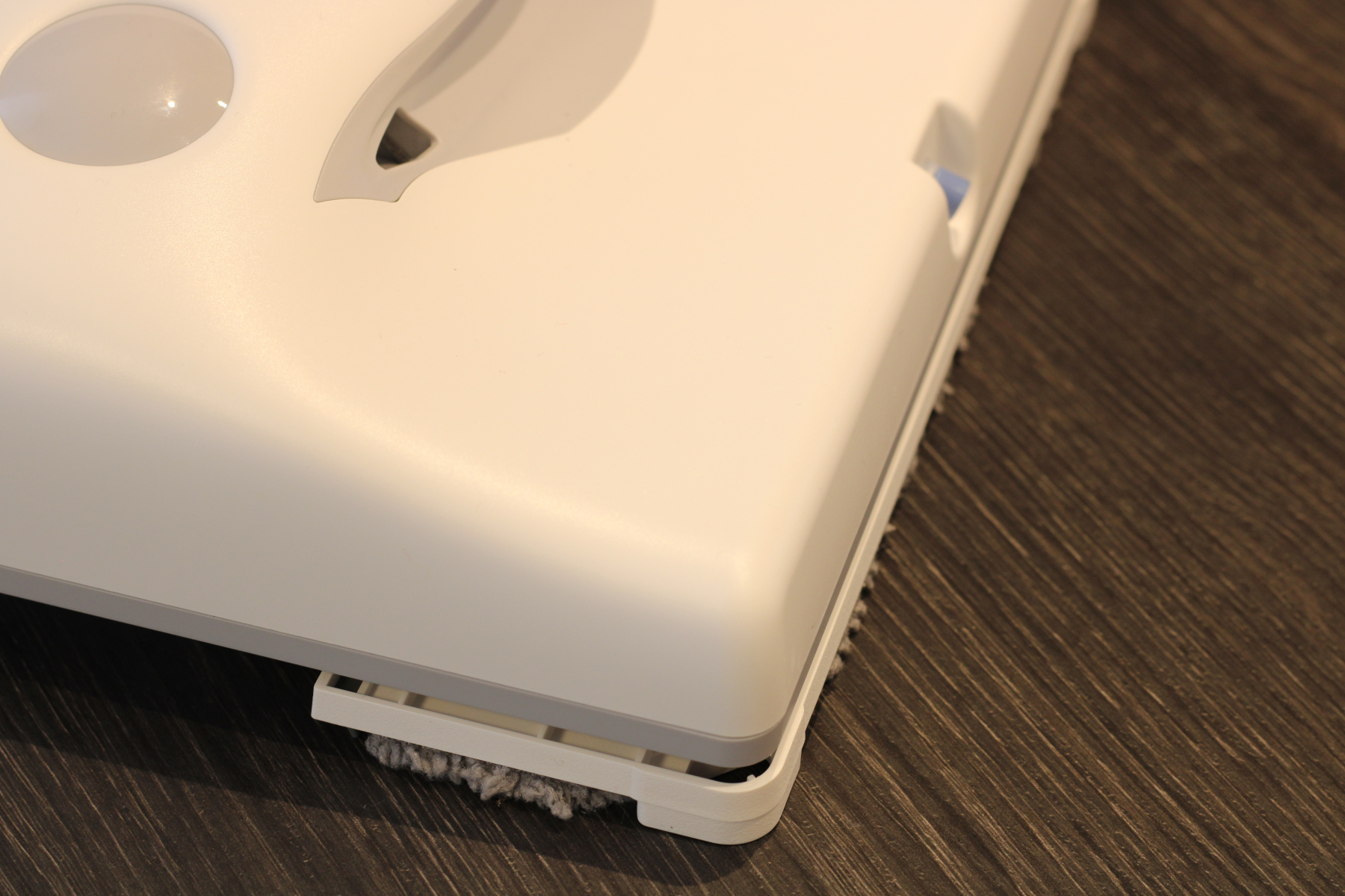 Die Verarbeitungsqualität gefällt uns gut. Das Gehäuse besteht vor allem aus Kunststoff. Dieser ist sehr fest und fühlt sich auch hochwertig an. Selbst bei starker Belastung können wir das Material nicht eindrücken oder gar verbiegen. Dementsprechend würde der Roboter vermutlich sogar einen Sturz überleben, was aber natürlich in der Praxis nicht passieren sollte. Auffällige Spaltmaße entdecken wir genauso wenig, wie Produktionsrückstände. Das spricht für eine gute Fertigungsqualität. Das Tuch ist mit Klett an der Unterseite befestigt und hält sehr fest. Es besteht also keine Gefahr, dass es verrutscht.