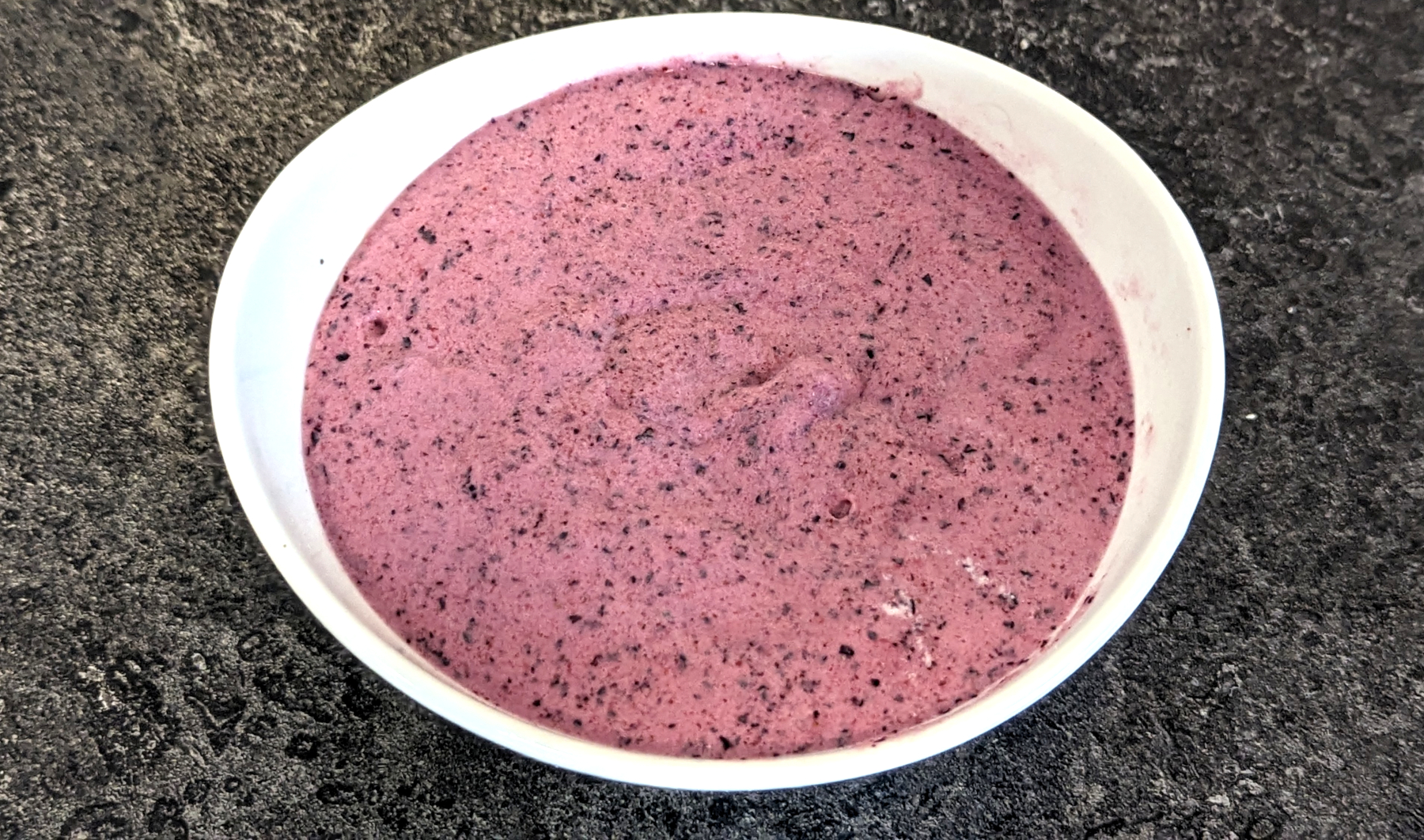 Im dritten Test bekommt der Zerkleinerer eine weitere Chance. Wir kombinieren die aufgeschlagene Sahne mit Erdbeeren und Blaubeeren, um ein Eis herzustellen. Diese Aufgabe bewerkstelligt der Stabmixer zufriedenstellend und ohne größere Stücke. Die Performance ist deutlich besser als bei den Haselnüssen.