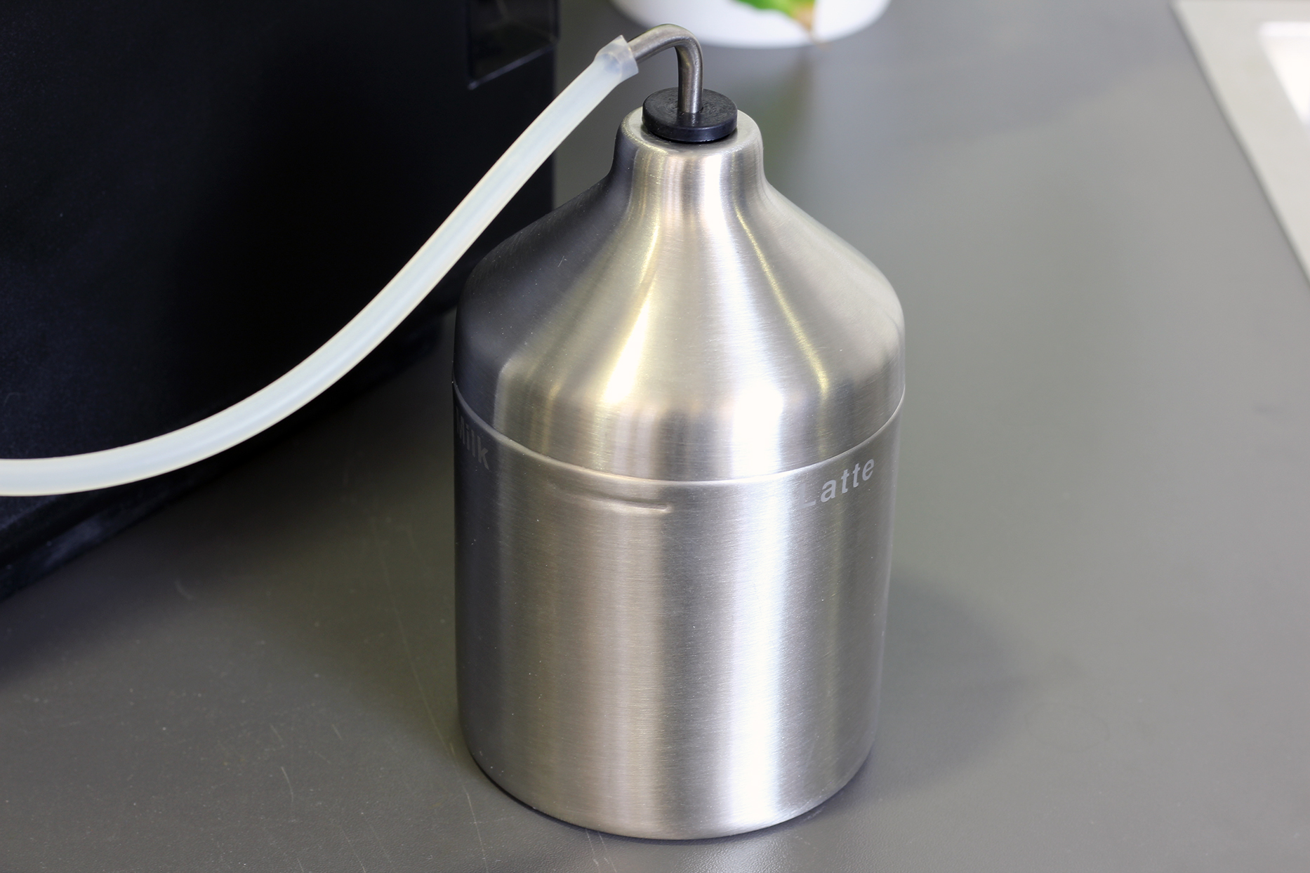 Wie sich aus der Kaffeeauswahl bereits ableiten lässt, bereitet die Evidence auf Knopfdruck auch Milchspezialitäten zu. Dazu verfügt die Maschine über einen separaten Edelstahltank, der über einen Schlauch mit dem Kaffeeauslauf verbunden wird. Der Auslauf lässt sich wie bei den meisten Geräten üblich in der Höhe verstellen. Somit finden auch größere Latte-Macchiato-Gläser bis zu einer Höhe von 15 Zentimetern Platz.