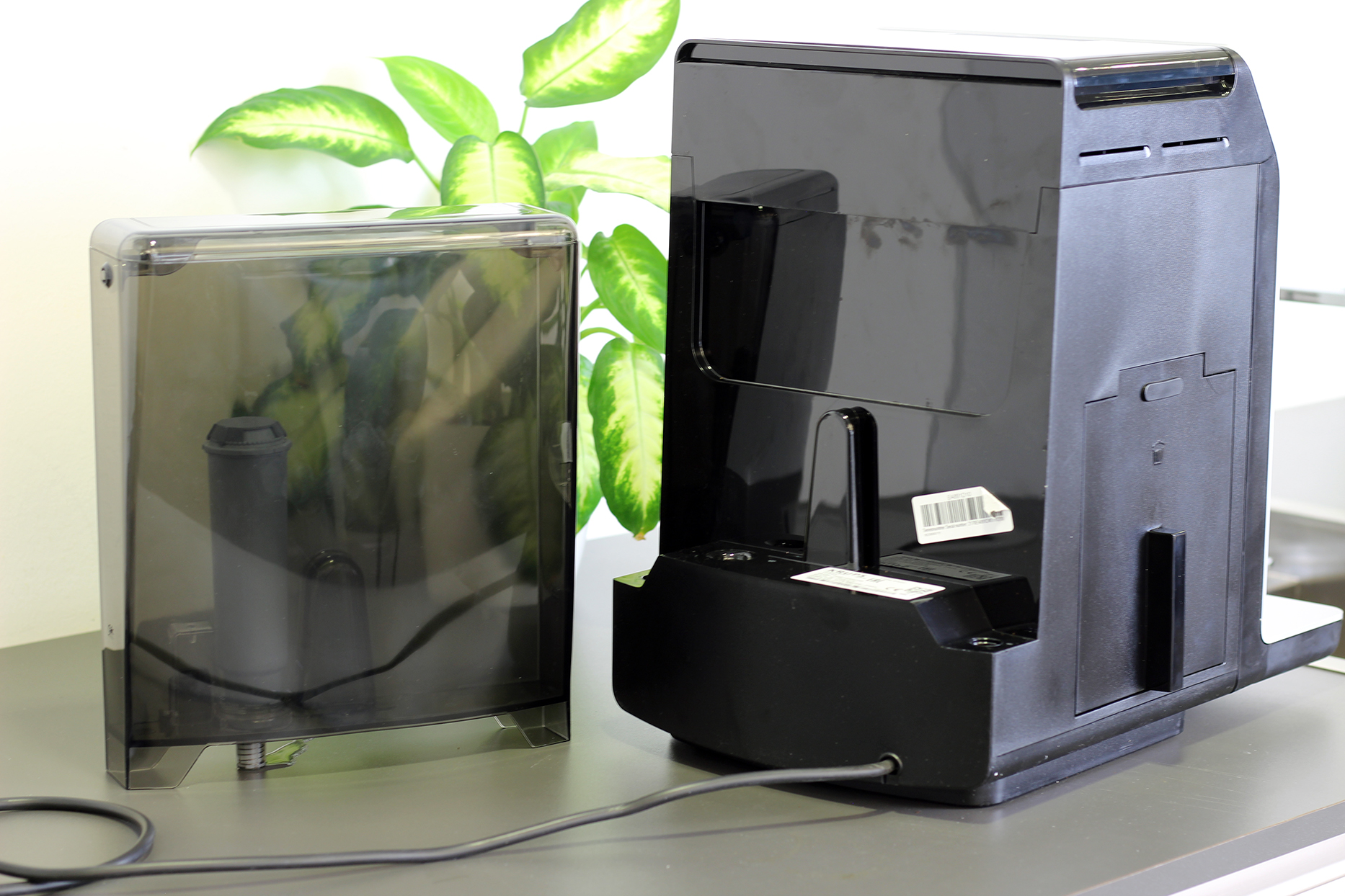 Die Bedienung der Krups Evidence hat uns vor keine größeren Hürden gestellt. Ganz selbsterklärend ist die Handhabung zwar nicht, die Bedienungsanleitung hilft bei Problemen aber weiter. Sie überzeugt durch ausführliche Texte mit begleitenden Farbbildern – so muss es sein. Krups hat der Evidence ein kleines Schwarz-Weiß-Display mit einer Diagonale von sechs Zentimetern spendiert. Hier wird der Nutzer Schritt für Schritt durch die Inbetriebnahme geführt. Neben Datum, Uhrzeit und Maßeinheit ist vor allem die Eingabe der Wasserhärte wichtig, da diese die Zubereitung maßgeblich beeinflusst. Krups hat direkt ein kleines Stäbchen zur Ermittlung des Härtegrades beigelegt. Falls das heimische Wasser es erforderlich macht, befindet sich auch noch eine Kalkfilterpatrone im Lieferumfang, die sich in den Wassertank eindrehen lässt – vorbildlich.