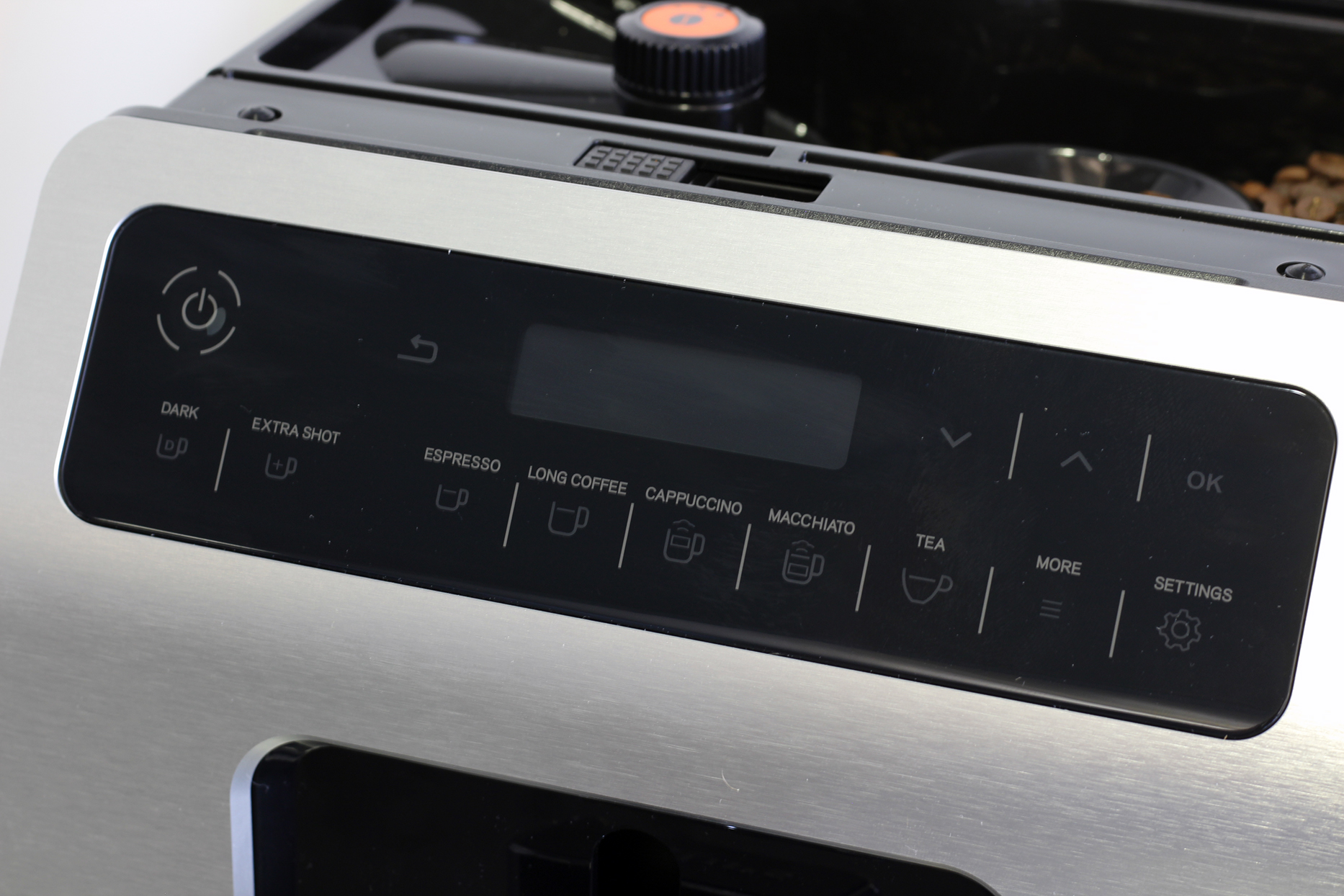 Alle Bedienelemente befindet sich auf der leicht abgeschrägten oberen Frontseite. Es handelt sich ausschließlich um zuverlässig reagierende berührungsempfindliche Tasten. Zum Ein- und Ausschalten des Kaffeevollautomaten findet sich die Power-Taste an der linken Seite. Neben dem Display hat Krups die Zurücktaste platziert. Diese dient der Navigation in den Menüs, aber auch zum Unterbrechen der Zubereitung. Unter dem Bildschirm befinden sich die fünf Direktwahltasten für Espresso, Long Coffee, Cappuccino, Macchiato und Tee. Über den Punkt „More“ lassen sich weitere Spezialitäten wie Ristretto zaubern. Insgesamt sind wir mit dem Getränkeangebot zufrieden – alle wichtigen Kaffeesorten sind vorhanden.