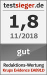 Insgesamt hat uns die Krups Evidence EA891D überzeugt. Der Kaffeevollautomat punktet durch eine sehr gute Verarbeitungsqualität und kompakte Abmessungen. Die Bedienung hat uns vor keine größeren Probleme gestellt, im Zweifel leistet die Bedienungsanleitung gute Dienste. In puncto Ausstattung schwächelt die Maschine dagegen leicht. Wir hätten uns als Alternative zum Mahlwerk noch ein Pulverfach gewünscht. Zudem geizt die Evidence etwas mit Einstellmöglichkeiten. Bei der Zubereitung und den Ergebnissen haben wir dagegen fast nichts zu meckern. Die entsprechenden Getränke überzeugen durch eine dichte Crema und auch der Milchschaum hat einen positiven Eindruck hinterlassen.