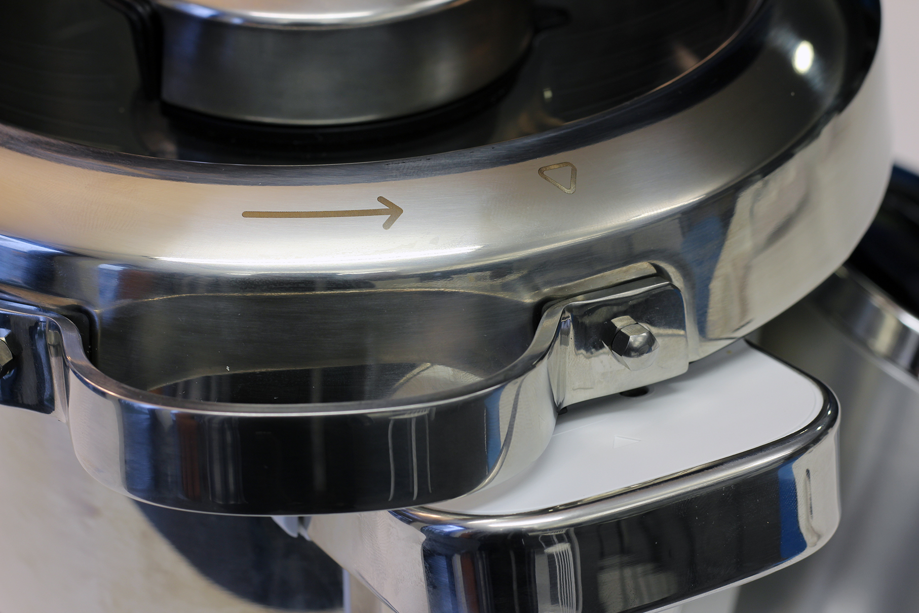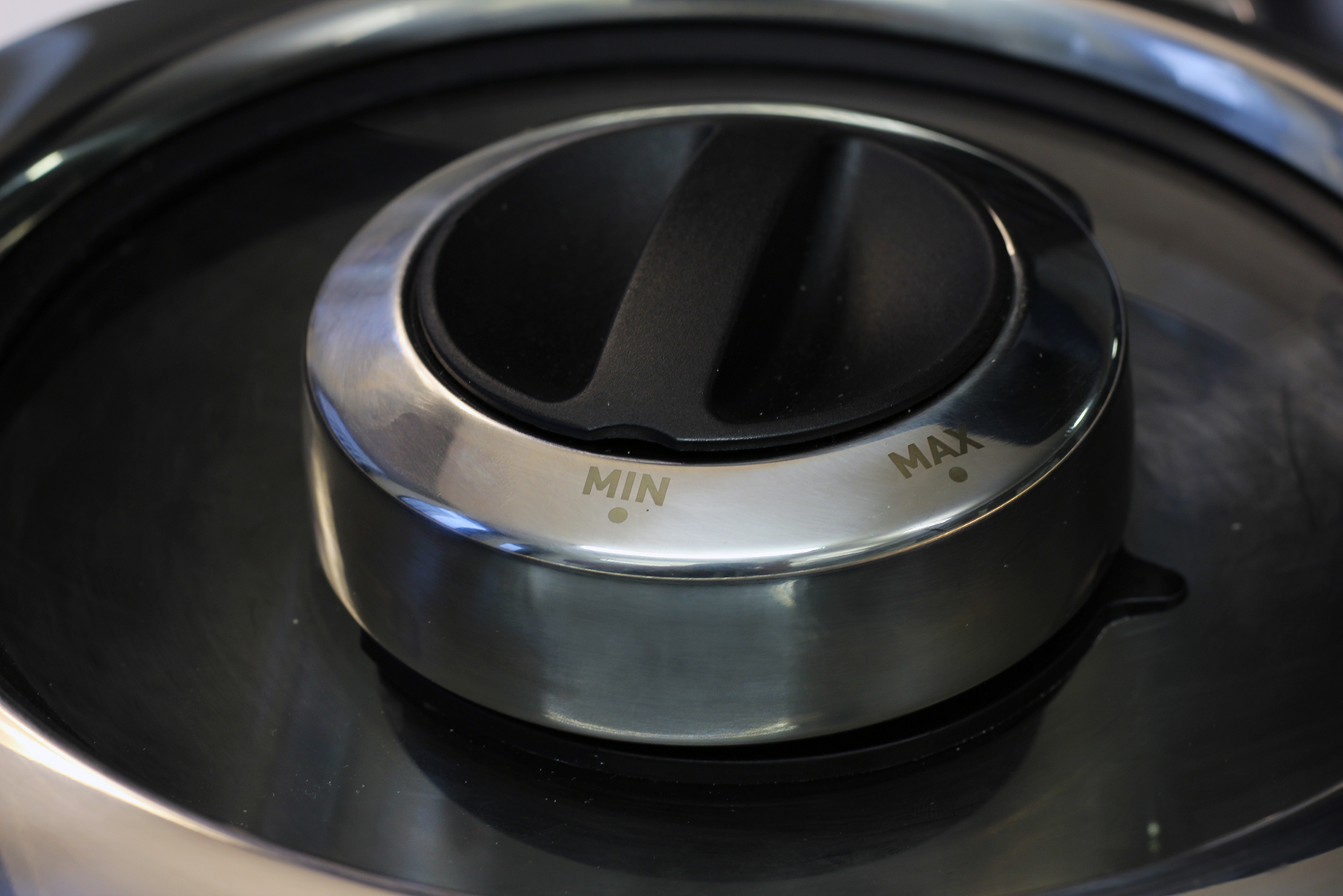 Die Handhabung der Krups i Prep&Cook Gourmet hat uns vor keine größeren Probleme gestellt. Der Topf lässt sich nur in einer Position auf die Motor- und Kocheinheit aufsetzen und rastet fest ein. Über zwei leichtgängige Tasten an der Unterseite der Griffe lässt er sich problemlos lösen und entnehmen. Der Deckel wird auf den Topf gesetzt und mit einer Drehbewegung verschlossen. Damit der Nutzer die korrekte Position findet, verfügen die Abdeckung und der linke Topfgriff über eine entsprechende Markierung. Werden diese übereinandergesetzt, lässt sich der Deckel gut schließen – auch wenn dazu recht viel Kraft nötig ist. An der Oberseite befindet sich eine Einfüllöffnung. Bei der Zubereitung von Mayonnaise kann hier beispielsweise nach und nach Öl zugegeben werden. Die Öffnung lässt sich mit dem praktischen Dampfregler abdichten. Durch eine Drehbewegung lässt sich dieser öffnen und der Dampf kann entweichen. Im geschlossenen Zustand wird der meiste Dampf im Topf gehalten.