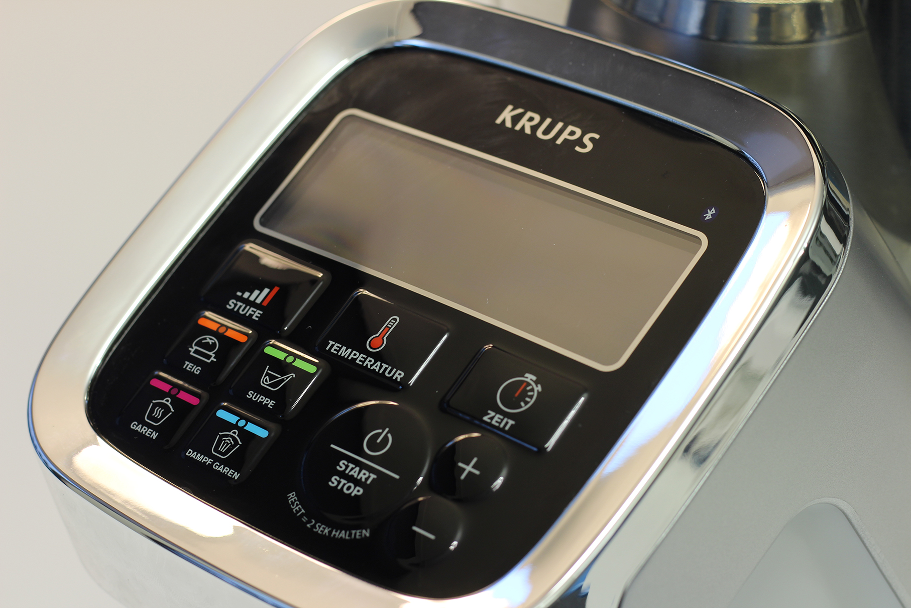 Im Vergleich zum Vorgängermodell hat sich das Fassungsvermögen des Topfs um 20 Prozent erhöht. Dadurch überzeugt die Küchenmaschine durch ein gutes Nutzvolumen von drei Litern und es lassen sich bis zu acht Personen gleichzeitig verköstigen. Dafür hat sich die Zahl der Automatikprogramme etwas reduziert. Insgesamt zehn verschiedene Programme beherrscht die Krups aufgeteilt in die Überkategorien Teig, Suppe, Garen und Dampfgaren. Geschwindigkeit, Kochtemperatur und Zubereitungszeit werden dann automatisch eingestellt. Das dritte Automatikprogramm im Bereich Garen ist beispielsweise explizit für Risotto oder ähnliche Gerichte vorgesehen. Hier wird der Reis für 20 Minuten bei 95 Grad in Intervallen gerührt. Natürlich lassen sich auch alle Einstellungen manuell auswählen.