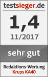 Die Krups KA40 ist eine hervorragende Küchenmaschine. Es kommen fast ausschließlich hochwertige Materialien zum Einsatz. Dadurch punktet die Maschine durch ein optisch ansprechendes Äußeres und eine gute Verarbeitungsqualität. Mit Reibevorsatz und Mixer kann sich die Ausstattung ebenfalls sehen lassen. Bedienung und Handhabung gehen nach einer kurzen Gewöhnungsphase einfach von der Hand. Die drei Rühraufsätze haben uns im Test voll überzeugt, vor allem der perfekte Eischnee. Die Reiben liefern ebenfalls gute Ergebnisse, auch wenn sie teilweise nicht ganz gleichmäßig sind. Der Mixer fällt etwas ab, vor allem mit groben Stücken hat er Probleme. Dafür überzeugt die Krups KA40 durch einen recht leisen Betrieb und eine einfache Reinigung.