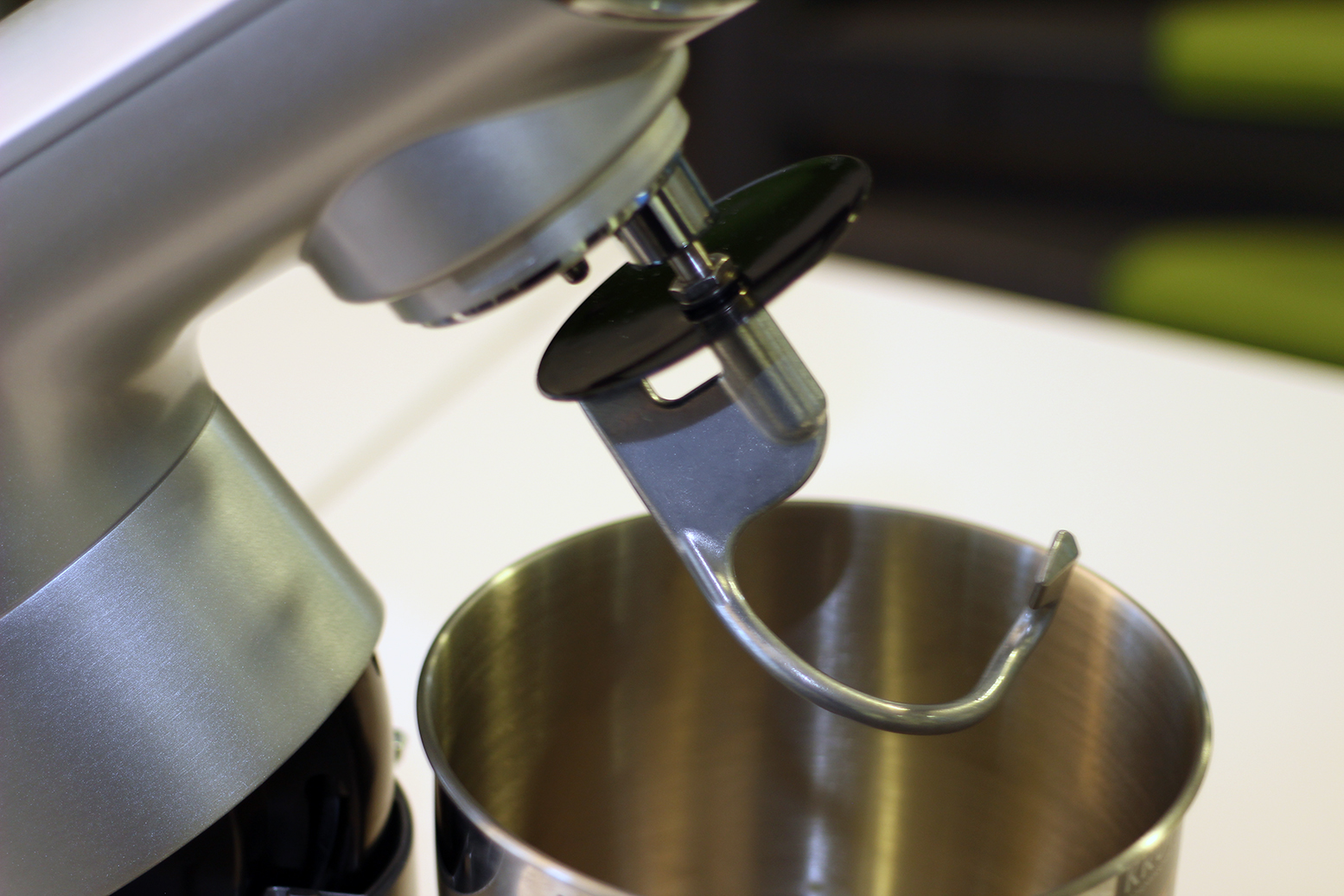 Über einen Hebel neben dem Drehrad fährt der Rührarm nach oben. Dann lassen sich die drei Rühreinsätze – ebenfalls durch eine Drehbewegung – anbringen. Wenn man sich einmal an das System gewöhnt hat, funktioniert der Wechsel zwischen dem Zubehör problemlos. Die Rührschüssel lässt sich darunter einhaken und hält sehr sicher. Der dazugehörige Deckel wird fest am Rührarm befestigt und verfügt über eine Öffnung, um Lebensmittel nachzufüllen.