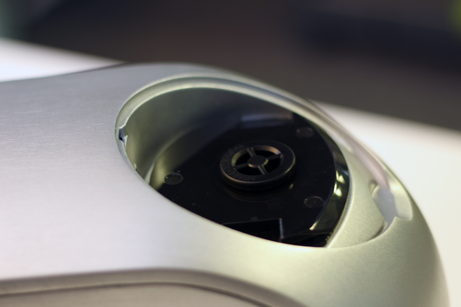 Der Antrieb für den Reibvorsatz findet sich unter einer Abdeckung an der Vorderseite. Mit einer leichten Drehbewegung rastet der Vorsatz ein und hält sehr fest. Lösen lässt er sich nur noch über den entsprechenden Knopf. Zum Einsetzen der vier Reiben einfach die Kunststoffabdeckung abdrehen. Hier ist äußerste Vorsicht geboten, da vor allem die Scheibenreibe extrem scharf ist. Die Lebensmittel werden über eine Öffnung an der Oberseite eingefüllt und lassen sich über einen Kunststoffeinsatz nach unten drücken.