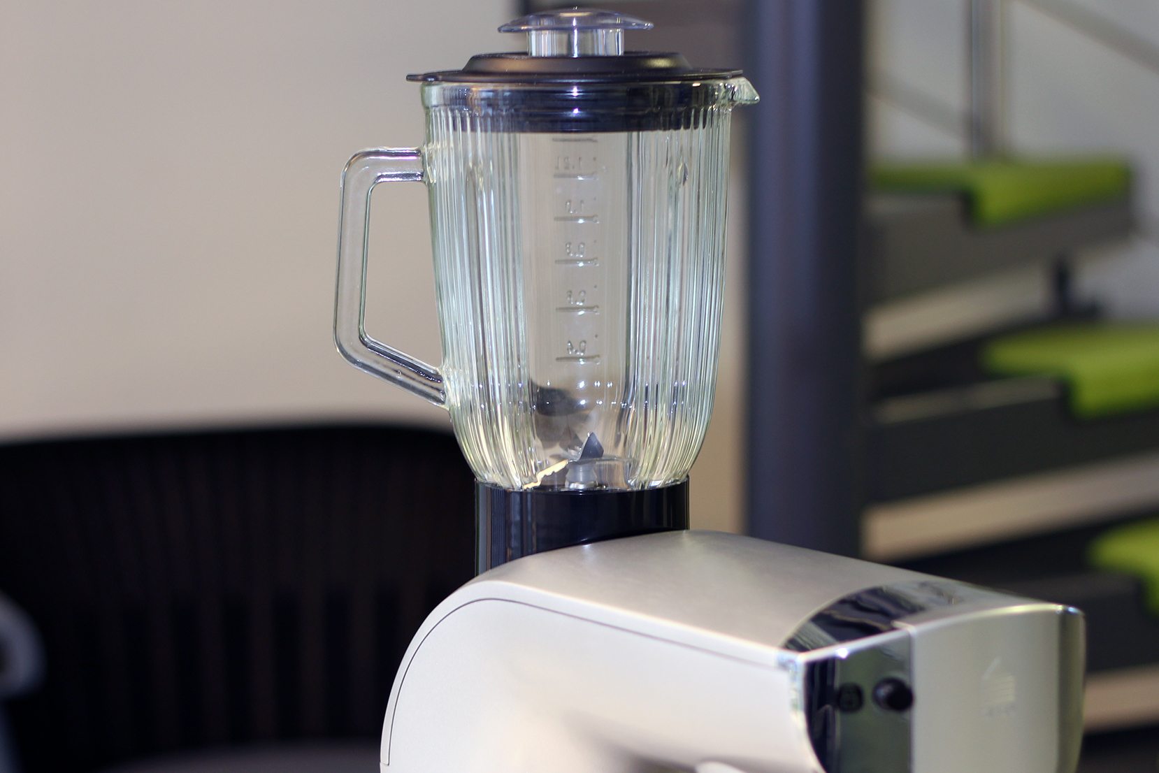 Über einen Hebel neben dem Drehrad fährt der Rührarm nach oben. Dann lassen sich die drei Rühreinsätze – ebenfalls durch eine Drehbewegung – anbringen. Wenn man sich einmal an das System gewöhnt hat, funktioniert der Wechsel zwischen dem Zubehör problemlos. Die Rührschüssel lässt sich darunter einhaken und hält sehr sicher. Der dazugehörige Deckel wird fest am Rührarm befestigt und verfügt über eine Öffnung, um Lebensmittel nachzufüllen.