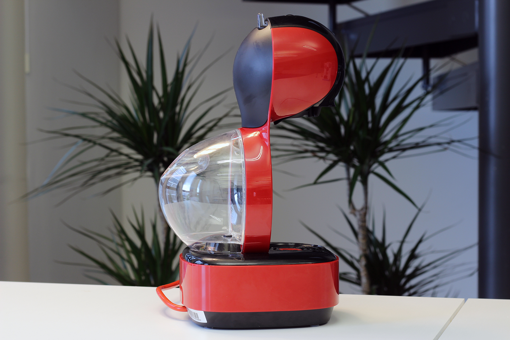 Die Nescafé Dolce Gusto Lumio ist in puncto Design in erster Linie auf Funktionalität und ein kompaktes Äußeres ausgelegt. Die Maschine ist vor allem in die Höhe gebaut. Auf dem Sockel mit einer Fläche von 19 Zentimetern in der Tiefe und 17 Zentimetern in der Breite thront der kugelförmige Wasserbehälter. Dieser steht allerdings hinten noch etwas über, was zu einer Gesamttiefe von circa 22 Zentimetern führt. Das Kugel-Design zieht sich auch bei der Bedien- und Kapseleinheit fort, die sich über dem Tank befindet. Das Design ist sicherlich Geschmackssache, für Küchen mit geringem Platzangebot erweist es sich jedoch als echter Segen.Die Maschine wurde fast ausschließlich aus Kunststoff gefertigt. Die verwendeten Materialien machen allerdings einen robusten Gesamteindruck. Selbst unter großem Kraftaufwand lässt sich das Plastik nicht verbiegen oder eindrücken. Allerdings sitzt der Wassertank etwas zu locker. Trotz der Hochglanzoptik ist die Kapselmaschine nicht anfällig für Fingerabdrücke. Selbst nach längerer Verwendung konnten wir keine unschönen Flecken erkennen. Dank der rundlichen Bauweise muss der Nutzer auch keine Angst vor scharfen Kanten oder spitzen, herausstehenden Teilen haben. Auffällig große Spaltmaße konnten wir nicht entdecken – einzig am Haltering für den Wasserbehälter kann sich etwas Schmutz ablagern. Das Stromkabel hat mit 90 Zentimetern eine durchschnittliche Länge, lässt sich allerdings nicht in der Maschine verstauen, was in Anbetracht der kompakten Abmessungen absolut verständlich ist. Da das Gerät über keinen eigenen Ein- und Ausschalter verfügt, sondern nach kurzer Untätigkeit automatisch in den Standby-Modus übergeht, bleibt nichts anderes übrig, als sie komplett vom Netz zu nehmen. Dann kann das durch die rote Farbwahl recht auffällige Kabel durchaus stören.