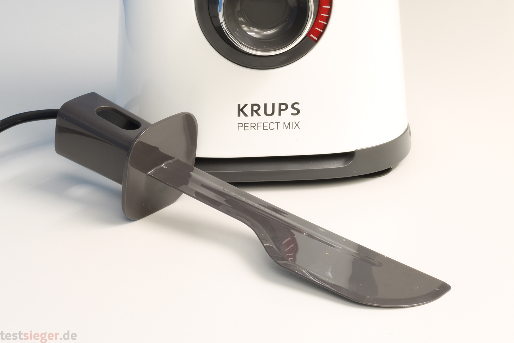 Das Stromkabel hat mit 1,15 Metern eine ordentliche Länge, auch wenn wir uns noch ein paar Zentimeter mehr gewünscht hätten. Trotzdem muss der Perfect Mix nicht direkt neben der Steckdose platziert werden. Das Kabel lässt sich allerdings nicht aufwickeln und stört daher bei Nichtgebrauch etwas. Der Glaskrug lässt sich nur in zwei Positionen auf der Basis anbringen – entweder zeigt der Griff nach recht oder nach links. Über eine leichte Drehbewegung rastet der Behälter ein. Erst in dieser Position symbolisieren drei Lichter über den Tasten in Kombination mit einem Signalton die Einsatzbereitschaft des Mixers – ein guter Sicherheitsmechanismus. Das Einfüllen der Lebensmittel in den 1,5-Liter-Krug gestaltet sich durch die große Öffnung mehr als einfach. Dank einer Liter-Maßanzeige lassen sich auch Gerichte wie kalte Suppen nach Rezept zubereiten. Über eine viereckige Öffnung im Deckel kann der Nutzer Lebensmittel nachfüllen. Um diese bei Bedarf noch einmal umzurühren oder vom Rand zu kratzen, verfügt der Krups über einen 17 Zentimeter langen Spachtel.