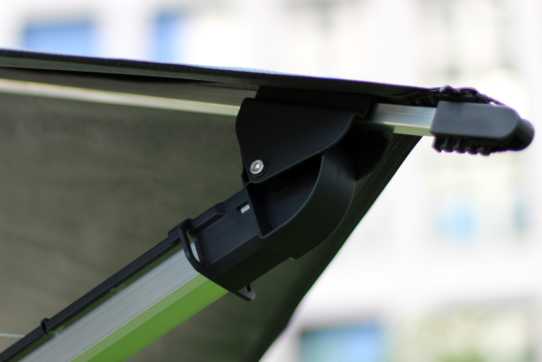 Das herausstechende Ausstattungsmerkmal der Leifheit LinoProtect 400 ist natürlich das integrierte Dach. Es ist mit Schlaufen an den Ecken befestigt und lässt sich auf Wunsch auch in vier Stufen straffer spannen oder abnehmen, falls es gereinigt oder doch einmal ersetzt werden muss. Hierzu muss der Nutzer noch die Kunststoffabdeckung an der Oberseite der Wäschespinne entfernen. In eingeklapptem Zustand erinnert die LinoProtect 400 eher an einen Sonnenschirm und misst trotz Dach nur knapp zwei Meter. Praktisch: Das Dach fungiert direkt als Schutzhülle für die Wäschespinne. Eine separate Abdeckplane oder ähnliches ist nicht mehr nötig. Über einen Gurt lässt sich die Leifheit verschnüren, damit sie bei Wind nicht aufgehen kann.