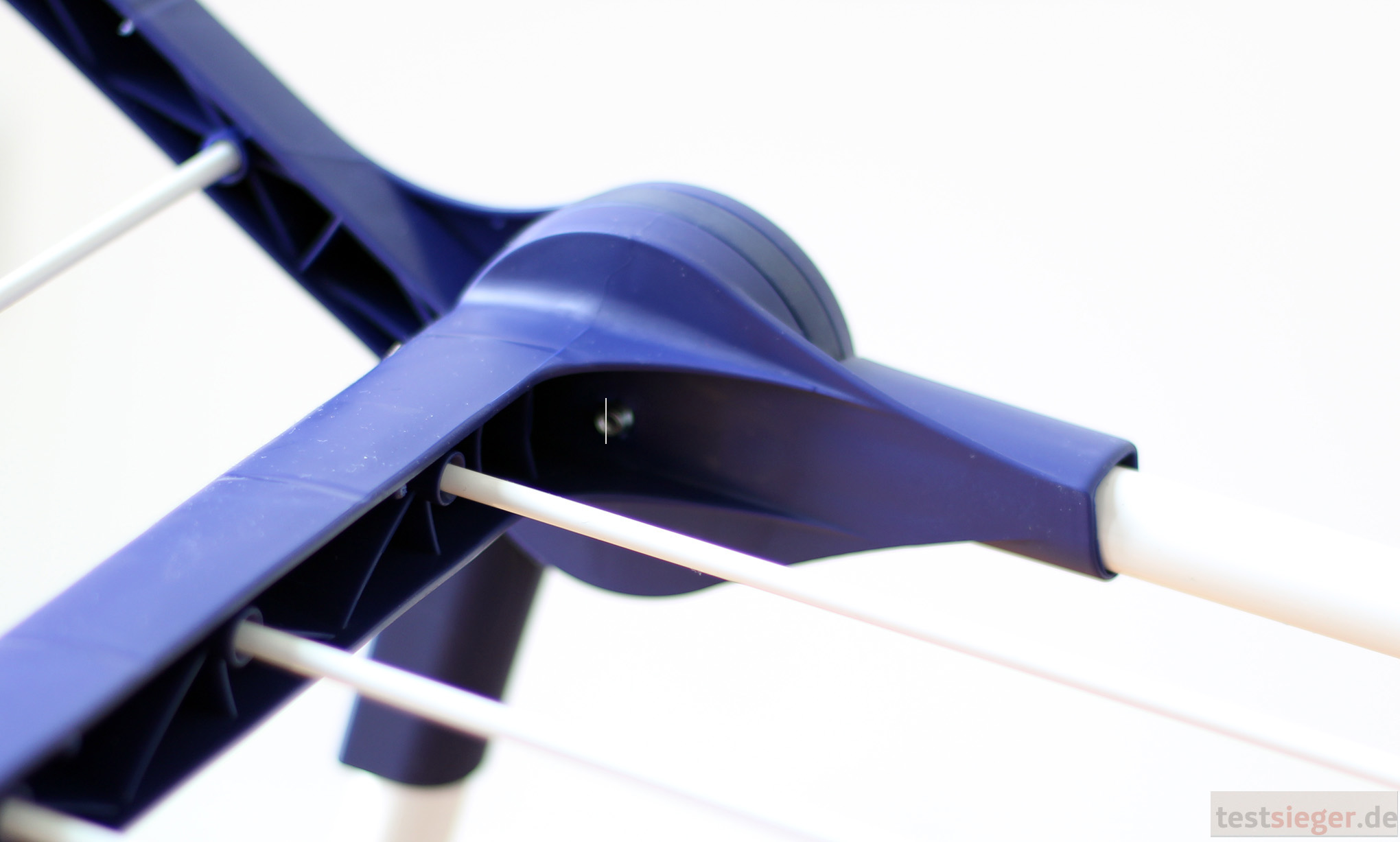Der Wäscheständer besteht aus einer Metall-Kunststoff-Kombination in weiß und blau. Das Modell wirkt auf uns zwar simpel, aber sehr solide. Das Konstrukt kommt ordentlich verarbeitet, wir haben kaum etwas zu beanstanden. Die Gelenke und Verbindungsstücke sind auch für schwerere Textilien stabil genug, die Trockenstäbe sitzen fest. Wir entdecken so gut wie keine scharfen Kanten oder spitze, herausstehende Komponenten. Einzig innen an den Verbindungsstücken zwischen Korpus und Flügeln fallen uns sehr scharfkantige Kunststoffspitzen auf. Die Gefahr, dort einmal hängen zu bleiben, halten wir allerdings für gering.