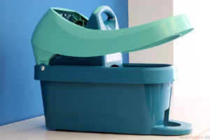 Die Wischtuchpresse besteht fast ausschließlich aus Kunststoff. Die Qualität hinterlässt jedoch einen guten Eindruck. Einzig die Seitenwände lassen sich etwas eindrücken, was aber nicht weiter dramatisch ist. Einige Kanten sind leicht scharf, Verletzungsgefahr besteht jedoch nicht. Zudem findet sich der ein oder andere unschöne Produktionsrückstand. Die Bodenwischer-Stange besteht dagegen aus Metall, die Qualität könnte jedoch besser sein. Bereits bei mittlerem Kraftaufwand knickt die Stange an den Verbindungsstellen leicht ab. Hier ist definitiv etwas Vorsicht beim Putzen geboten. Zudem ist der Klickmechanismus zwischen Stange und Putzeinheit etwas wackelig, was der Stabilität der Gesamtkonstruktion schadet.