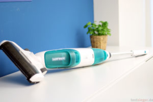 Die Bedienungsanleitung ist insgesamt gut verständlich und geht auf alle wichtigen Funktion in Text- und Bildform ein. Alles in Allem stellt uns die Handhabung vor keine größeren Probleme. Die Bedienung ist intuitiv und nach kurzer Zeit verinnerlicht. Das Gelenk zwischen Saugdüse und restlichem Gehäuse rastet praktischerweise in einem 90-Grad-Winkel ein. Bei Nichtgebraucht steht der Leifheit also problemlos von alleine und muss nicht unkomfortabel gegen eine Wand oder den Boden gelehnt werden.