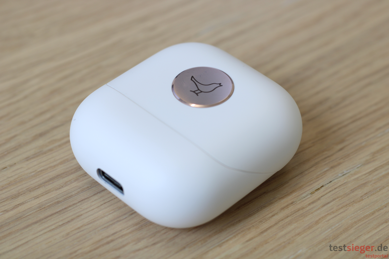 Libratone gibt die Akkulaufzeit mit bis zu 6 Stunden an. Das können wir im Dauertest bei aktiviertem Active Noise Cancelling nicht ganz bestätigen. Bei uns halten die Kopfhörer etwas über 5 Stunden am Stück durch. Wer auf die aktive Geräuschunterdrückung verzichtet, kommt jedoch gut auf die Herstellerangaben. Die Ladeschale bietet 3 weitere Ladungen, somit ergibt sich eine Gesamtlaufzeit von 24 Stunden. Das Einsetzen und Herausnehmen in das rechteckige Case klappt wunderbar einfach. Die Kopfhörer halten magnetisch fest und sitzen sicher. Die Ladeschale lässt sich entweder über das beiliegende USB-C-Kabel oder drahtlos über den Qi-Standard mit Strom versorgen. Der USB-C-Anschluss liegt dabei auf der Unterseite. Darum befindet sich ein LED-Ring. Bei Druck auf die Case-Taste gibt dieser den Ladestatus wieder. Blink er dreimal, ist die Schale noch nahezu voll, leuchtet der Ring rot, ist es Zeit, das Case mit Strom zu verbinden.