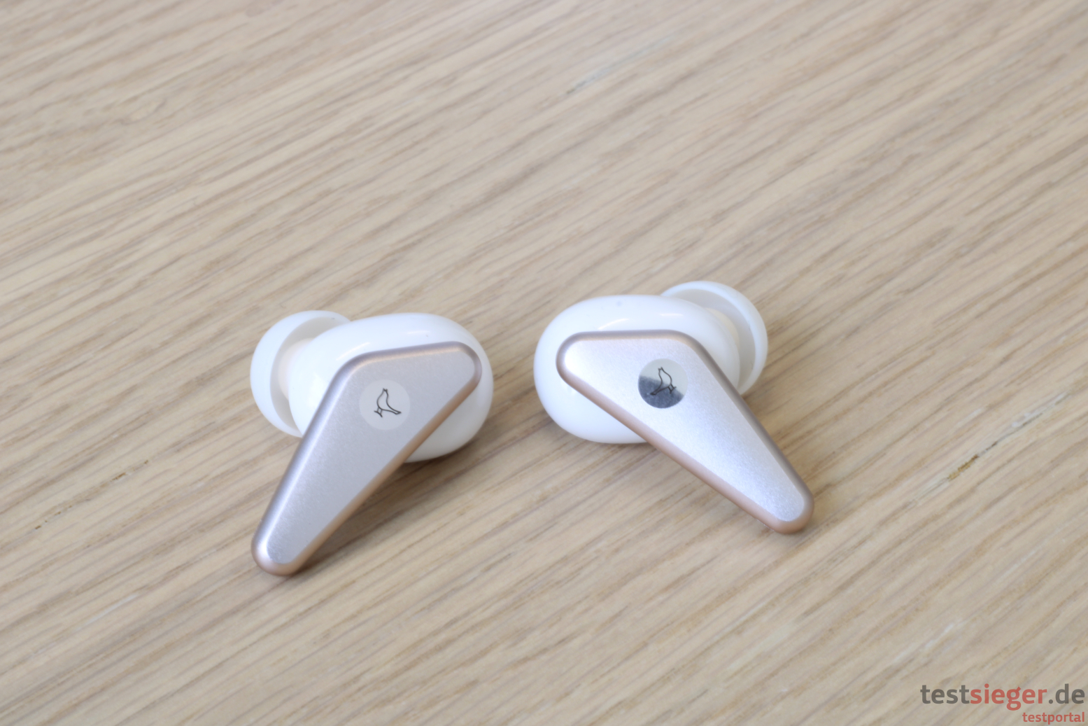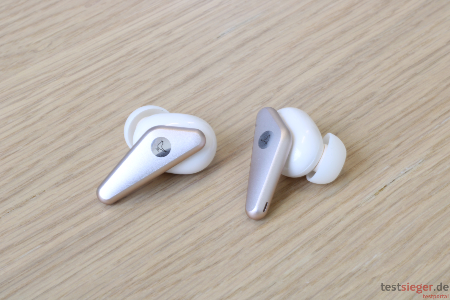 Die Libratone Air+ kommen im Stabdesign, wie es beispielsweise auch die OnePlus Buds Pro oder die Apple AirPods verwenden. Optisch unterscheiden sich die Libratone aber deutlich von den genannten Mitbewerbern. Der Stab ist recht kompakt und dreieckig gebaut. Der Ohrhörer ist oval gehalten, daran befinden sich noch die Silikonpolster, die im Gehörgang sitzen. Insgesamt liegen drei Paar Polster bei, um allen Nutzerinnen und Nutzern die optimale Passform zu bieten. Ein möglichst geschlossenes System ist vor allem für die aktive Geräuschunterdrückung wichtig. Wir sind vom Tragekomfort der Air+ begeistert. Die Kopfhörer sitzen perfekt und fühlen sich dabei angenehm leicht und luftig an, was natürlich in erster Linie am niedrigen Gewicht von 5,5 Gramm pro Hörer liegt. Dabei sitzen die Libratone trotzdem angenehm fest, selbst bei ruckartigen Bewegungen oder schnellem Joggen haben wir nie Angst, die Hörer könnten aus dem Gehörgang purzeln – perfekt. Selbst nach unserem mehrstündigen Akkutest fühlen wir kein unangenehmes Drücken im Ohr.